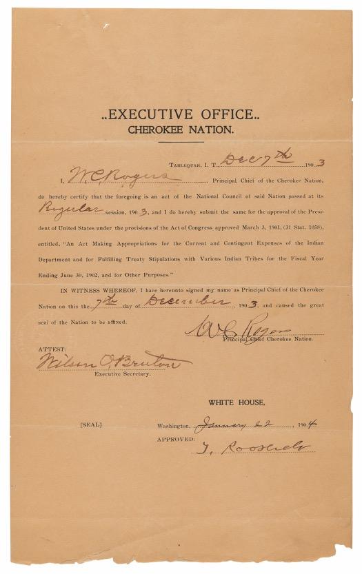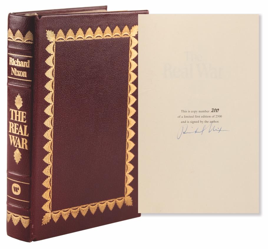 19. Theodore Roosevelt Signed Book as President - The Wilderness Hunter (Alleghany Edition). Signed book: The Wilderness Hunter: An Account Of The Big Game Of The United States And Its Chase With Horse, Hound And Rifle. Special ‘Alleghany Edition.’ NY: G. P. Putnam’s Sons/Knickerbocker Press, 1901. Hardcover bound in brown cloth with gilt stamping and design, 6.75 x 9.75, 472 pages. Nicely signed on the first free end page in ink as president, “Theodore Roosevelt, Sept. 1902.” Autographic condition: fine. Book condition: VG/None, with rubbing to boards, bumped corners, wear at spine ends, and a “Library of Lawrence E. Miller” blindstamp to the last page. When his first wife died in 1884, Theodore Roosevelt withdrew to his cattle ranch in western Dakota. There, he wrote Hunting Trips of a Ranchman (1885) and Thomas Hart Benton (1887) and began work on The Winning of the West (1889). He also penned this account of big-game hunting in the United States, with chapters on hunting lore, hunting with hounds, hunting the grizzly, and hunting from the ranch. Starting Bid $200