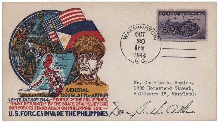 22. Dwight D. Eisenhower Signed ‘Shoulder Sleeve Insignia’ Presentation Sheet - Dated One Day Before Germany’s Unconditional Surrender (May 6, 1945). World War II-dated printed presentation sheet, signed in fountain pen by General Dwight D. Eisenhower, one page, 8 x 10.5, no date but postmarked May 6, 1945. The page is headed “Shoulder Sleeve Insignia, Supreme Headquarters, Allied Expeditionary Force,” and features a color image of the insignia below. A description of the meaning behind the design of the patch is printed at the bottom, explaining that the black background represents “the darkness of Nazi oppression,” the fiery crusader’s sword representing “avenging justice,” a rainbow comprised of the colors of the flags of the Allied forces to represent hope, and light blue at the top “emblematic of a state of peace and tranquility.” In fine condition.