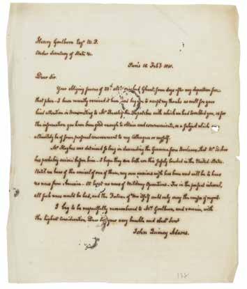 6. John Quincy Adams Press Copy Letter. Rare original press copy of an ALS by John Quincy Adams, one page, 7.5 x 9, February 15, 1815, addressed from Paris and sent to Under Secretary of State Henry Goulburn, referencing his departure from Ghent, where he had just negotiated the treaty that ended the War of 1812. In part: “Your obliging favour of 23d ulto. reached Ghent, some days after my departure from that place...Mr. Hughes was detained so long in descending the Garonne from Bordeaux, that Mr. Baker has probably arrived before him...Until we hear of the arrival of one of them, my own anxious wish has been and will be to hear no news from America. At least no news of military operations.” In very good to fine condition, with scattered small areas of paper loss due to ink erosion. Starting Bid $200