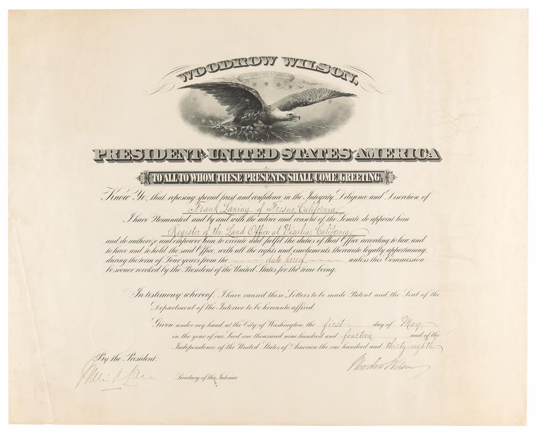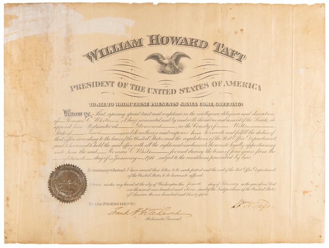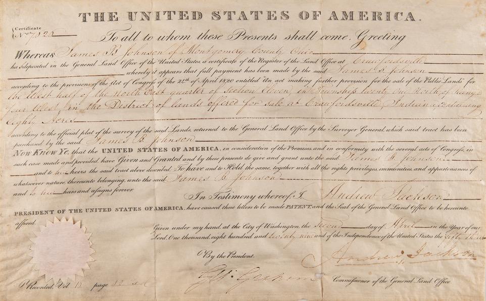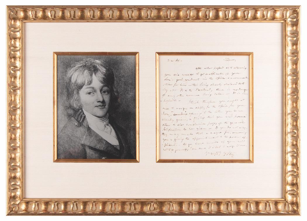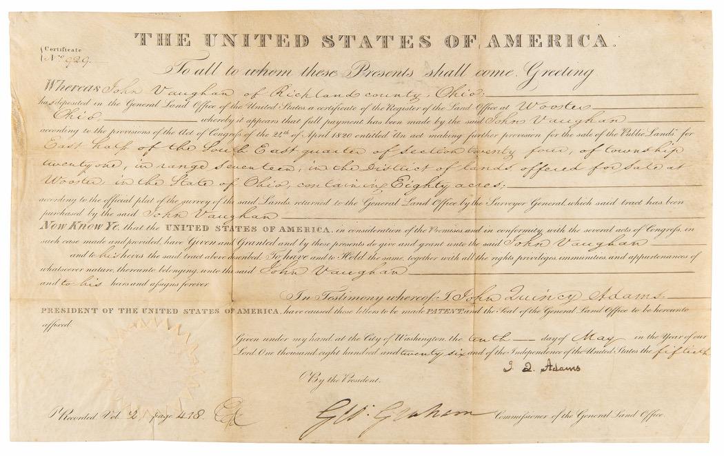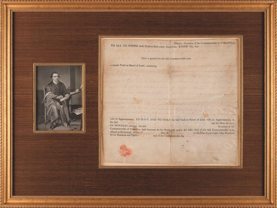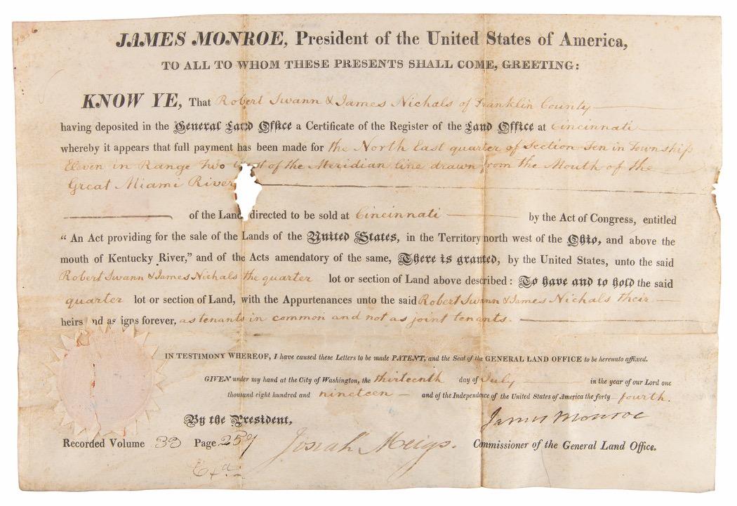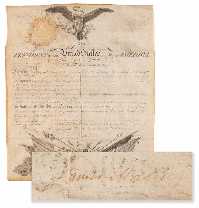 5. James Madison and James Monroe Document Signed as President and Secretary of State. Partly-printed vellum DS, signed “James Madison” as president and “Jas. Monroe” as secretary of state, one page, 14.5 x 8, March 3, 1812. President Madison grants John H. Bainton of Philadelphia a parcel of “the lands directed to be sold at Steubenville.” Neatly signed at the conclusion in ink by President James Madison and countersigned by Secretary of State James Monroe. The white paper seal affixed to the lower left remains fully intact. Archivally matted and framed with two portraits to an overall size of 19.5 x 18.75. In fine condition. Starting Bid $200