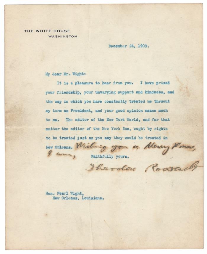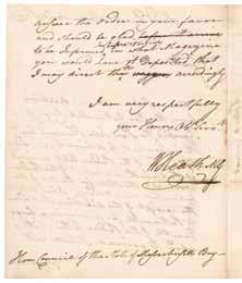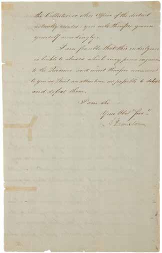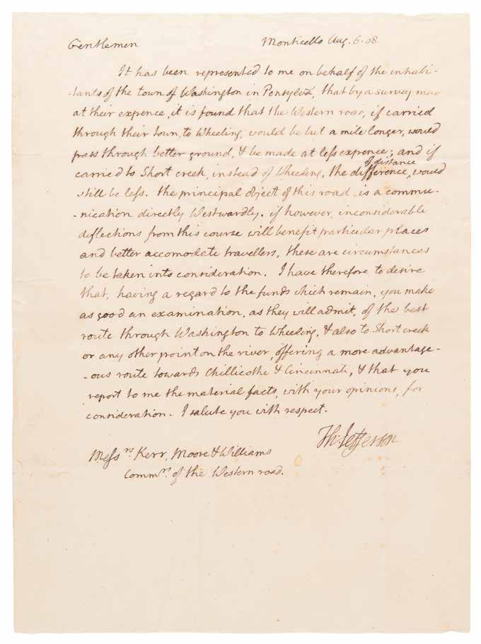 3. Thomas Jefferson Autograph Letter Signed as President on “the Western road” - The First Federally Funded Highway. Historically significant ALS as president signed “Th: Jefferson,” one page, 7.25 x 9.5, August 6, 1808. Handwritten letter to Messrs. Kerr, Moore & Williams, commissioners of the Western Road. In part: “It has been represented to me on behalf of the inhabitants of the town of Washington in Pensylv’a, that by a survey at their expence, it is found that the Western road, if carried through their town, to Wheeling, would be but a mile longer, would pass through better ground, & be made at less expence; and if carried to Short creek, instead of Wheeling, the difference of distance would still be less. The principal object of this road is a communication directly Westwardly. If however, inconsiderable deflections from this course will benefit particular places and better accommodate travellers, these are circumstances to be taken into consideration. I have therefore to desire that, having a regard to the funds which remain, you make as good an examination, as they will admit, of the best route through Washington to Wheeling, & also to Short creek or any other point on the river, offering a more advantageous route towards Chillicothe & Cincinnati, & that you report to me the material facts, with your opinions, for consideration.” In fine condition.