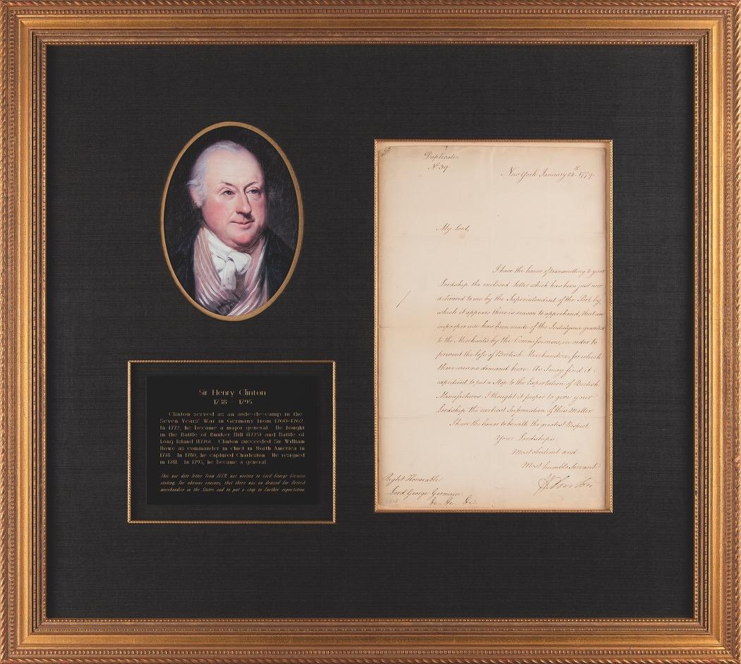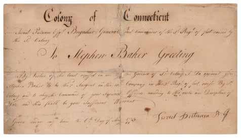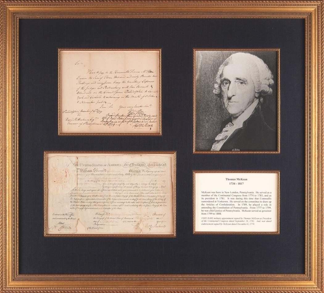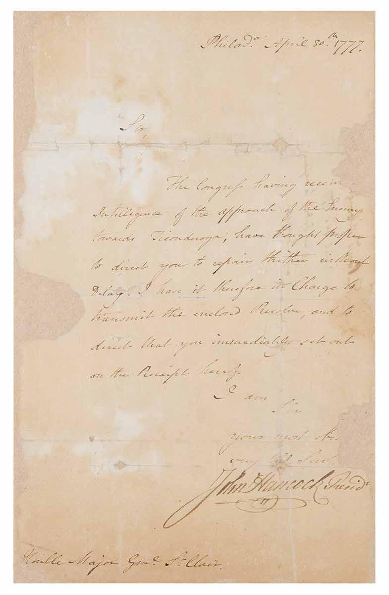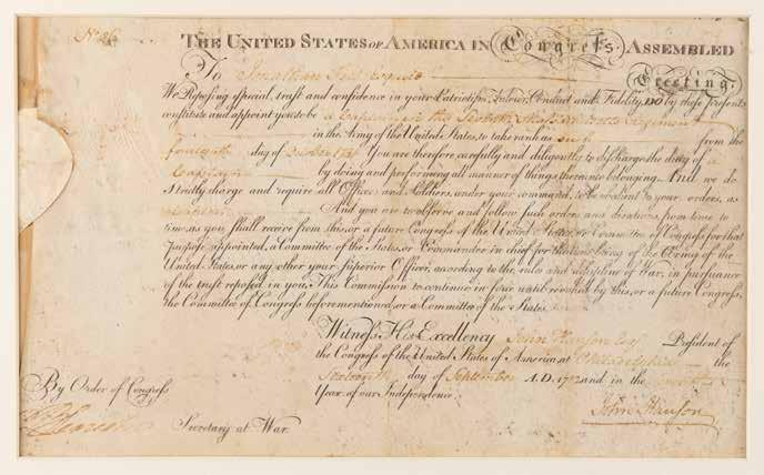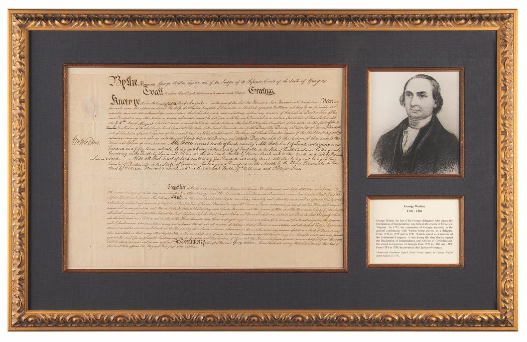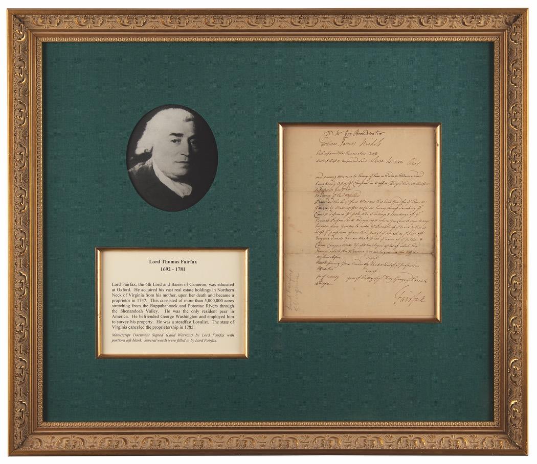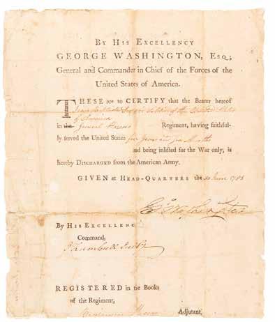1. George Washington Signed Revolutionary War Discharge Certificate (1783). Important Revolutionary War–dated partly-printed DS, signed “Go: Washington,” one page, 8.5 x 10, June 30, 1783. Continental Army military discharge headed “By His Excellency George Washington, Esq., General and Commander in Chief of the Forces of the United States of America.” In part: “These are to certify that the Bearer hereof Jean Baptiste Dupere, Soldier of the United States of America in General Hazen’s Regiment, having faithfully served in the United States five years and six months, and being inlisted for the War only, is hereby Discharged from the American Army.” Signed at the conclusion in ink by General George Washington, and countersigned below by Jonathan Trumbull, Jr. On the reverse is a statement noting that the certificate “shall not avail the Bearer as a Discharge, until the Ratification of the definitive Treaty of Peace,” and that he is to be considered on furlough until that time. In very good condition, with toning and soiling, foxing, and small areas of paper loss to the reinforced folds.