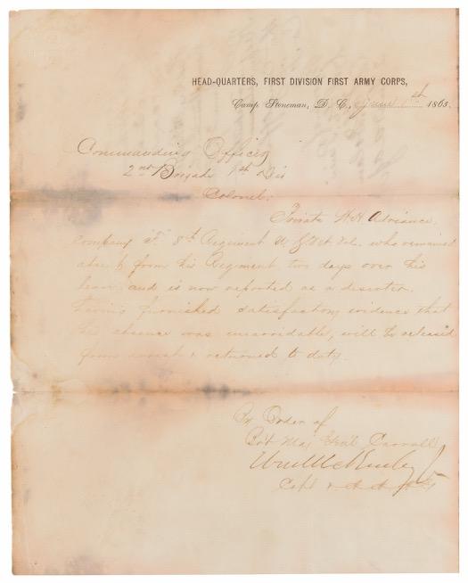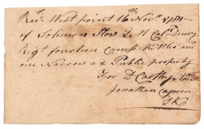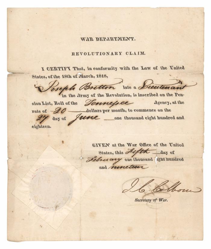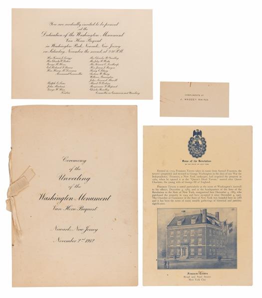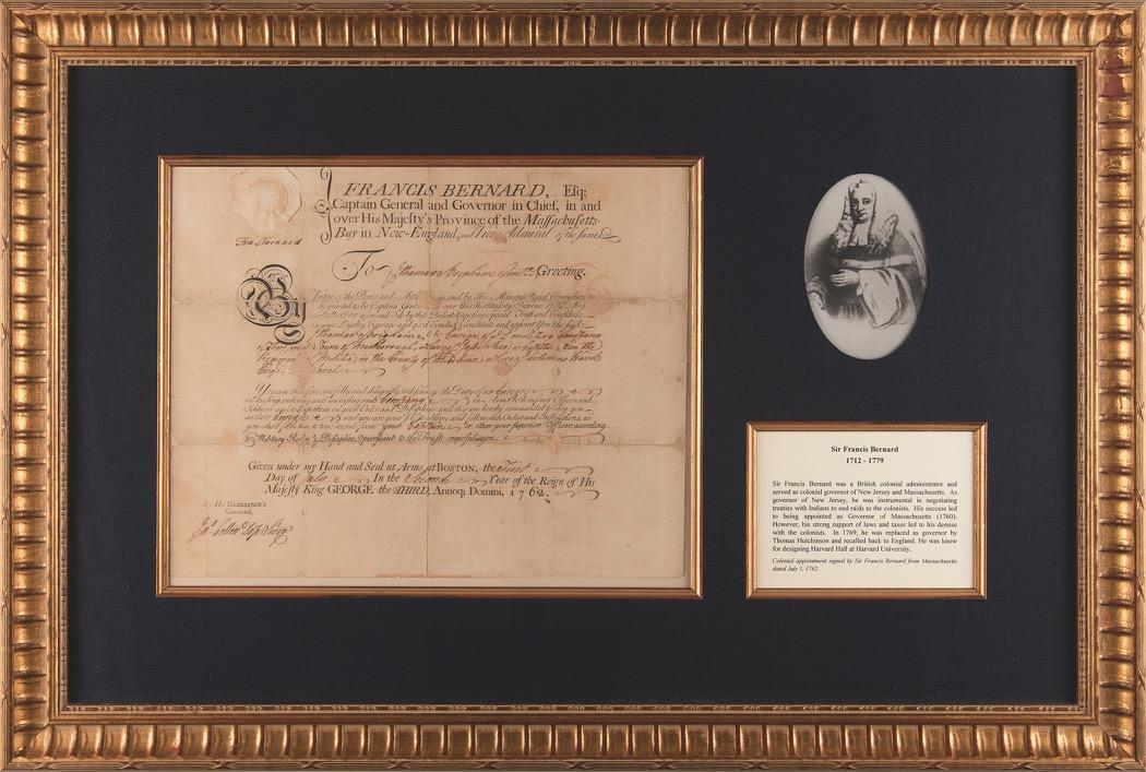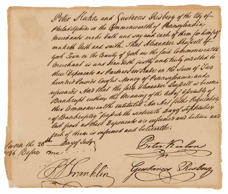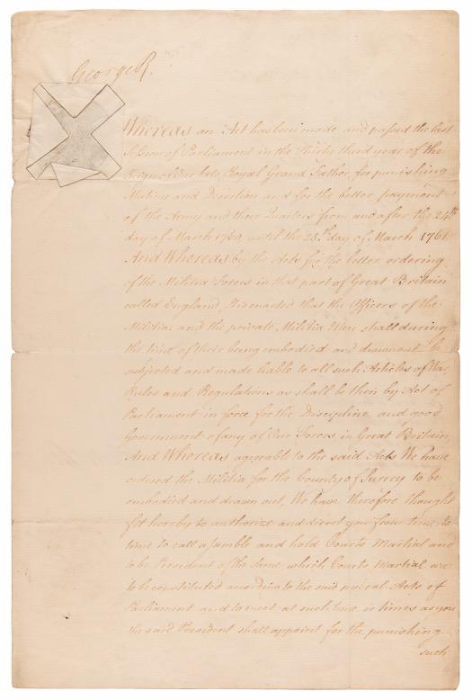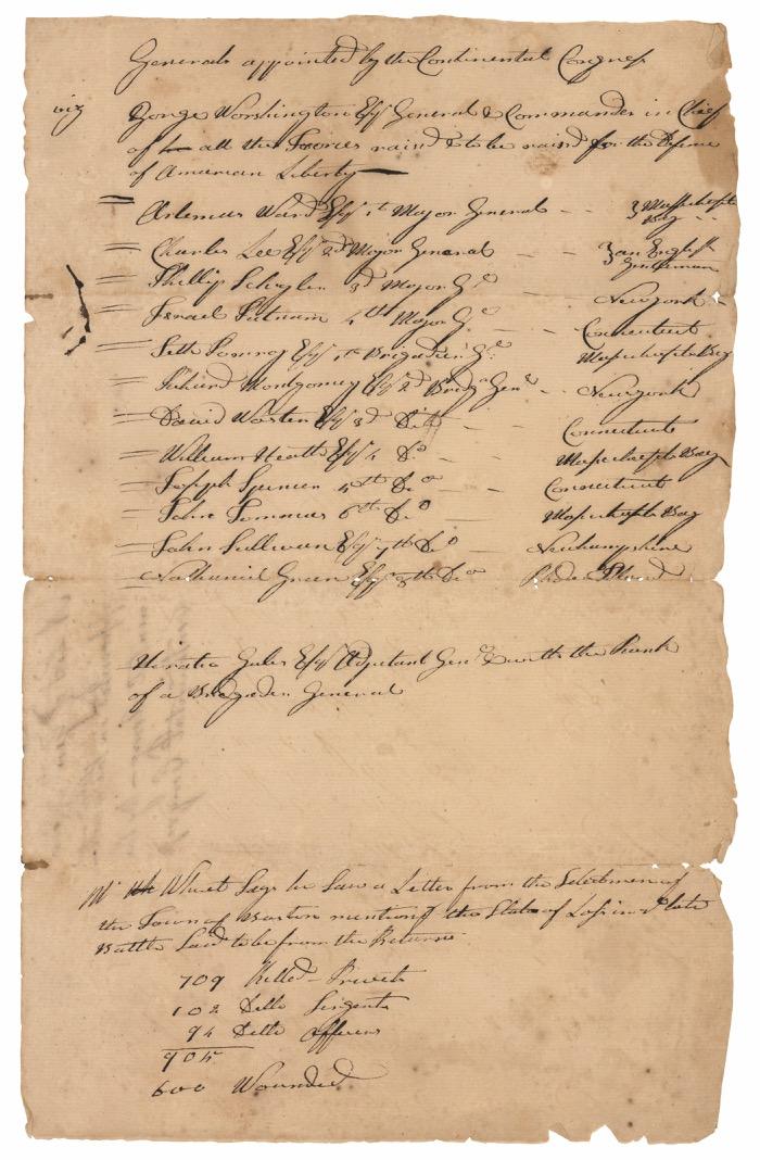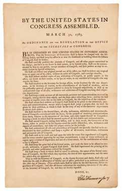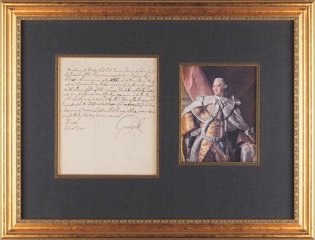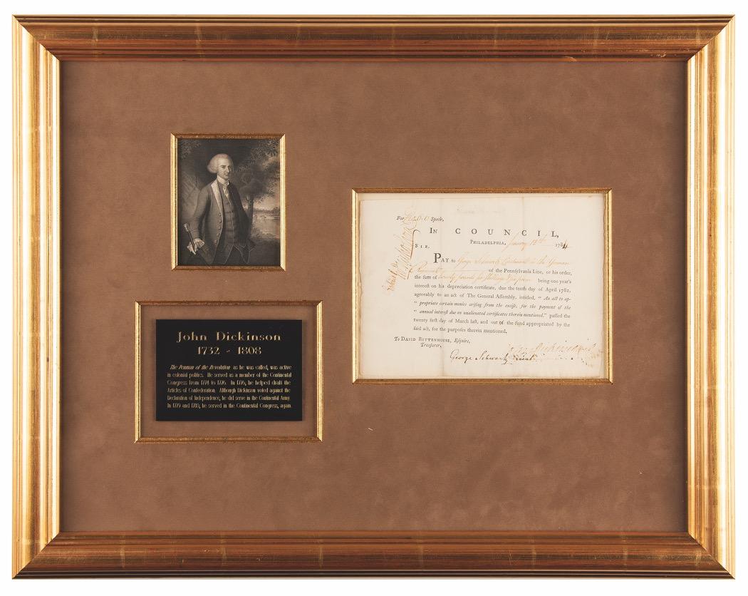 1. George Washington Signed Revolutionary War Discharge Certificate (1783). Important Revolutionary War–dated partly-printed DS, signed “Go: Washington,” one page, 8.5 x 10, June 30, 1783. Continental Army military discharge headed “By His Excellency George Washington, Esq., General and Commander in Chief of the Forces of the United States of America.” In part: “These are to certify that the Bearer hereof Jean Baptiste Dupere, Soldier of the United States of America in General Hazen’s Regiment, having faithfully served in the United States five years and six months, and being inlisted for the War only, is hereby Discharged from the American Army.” Signed at the conclusion in ink by General George Washington, and countersigned below by Jonathan Trumbull, Jr. On the reverse is a statement noting that the certificate “shall not avail the Bearer as a Discharge, until the Ratification of the definitive Treaty of Peace,” and that he is to be considered on furlough until that time. In very good condition, with toning and soiling, foxing, and small areas of paper loss to the reinforced folds.