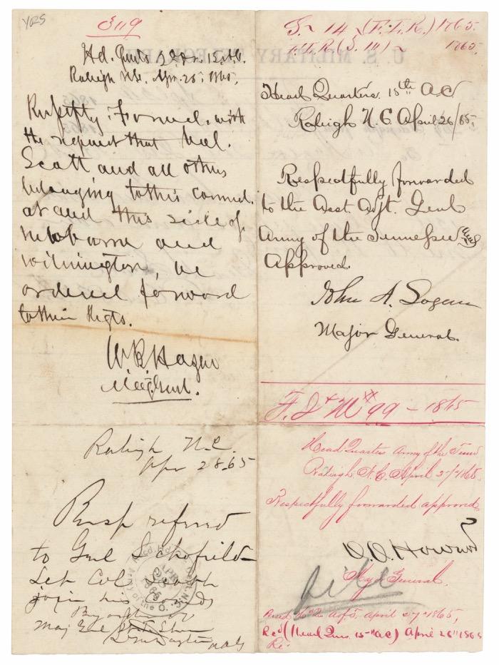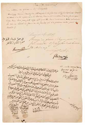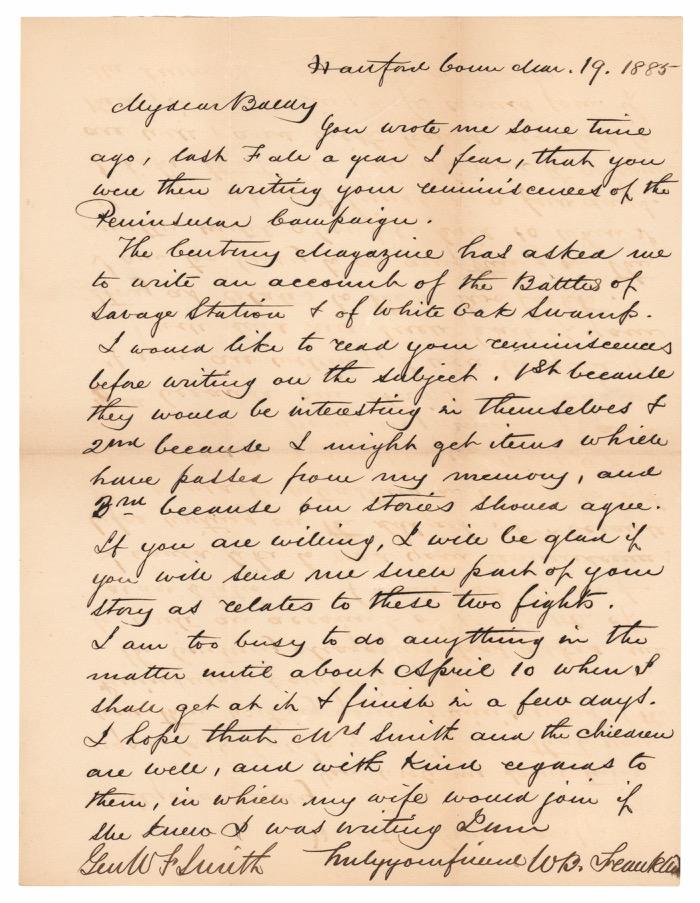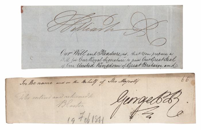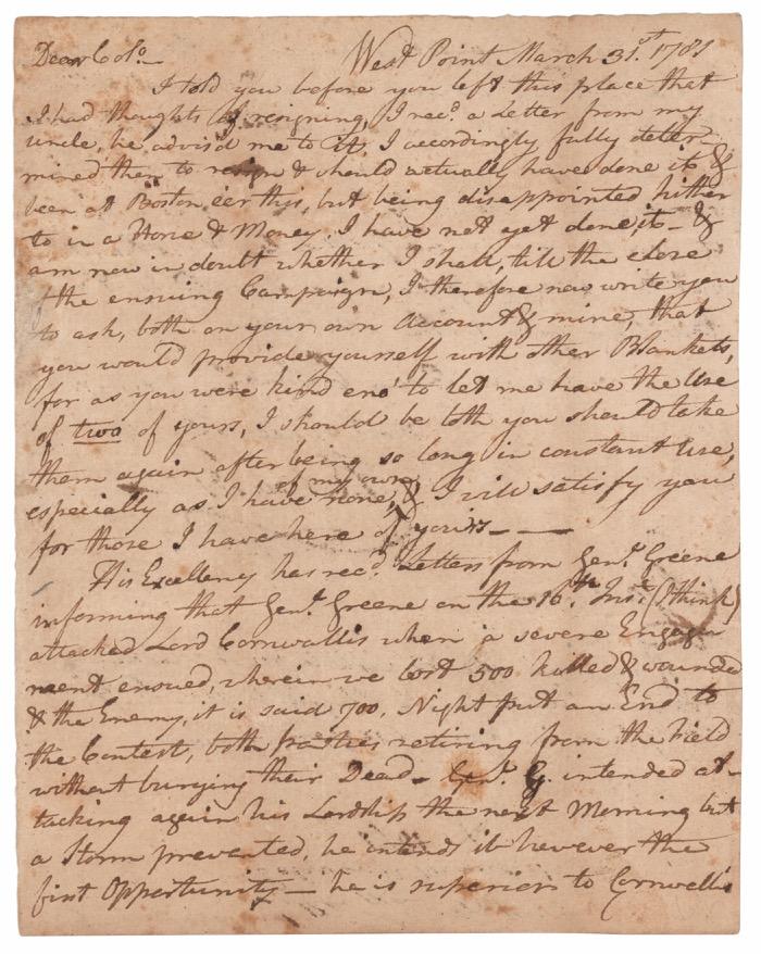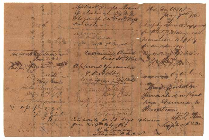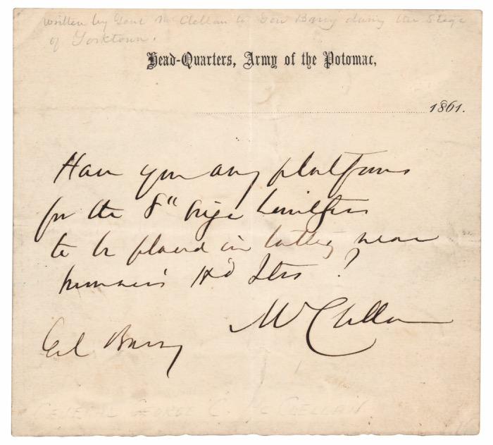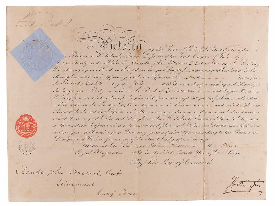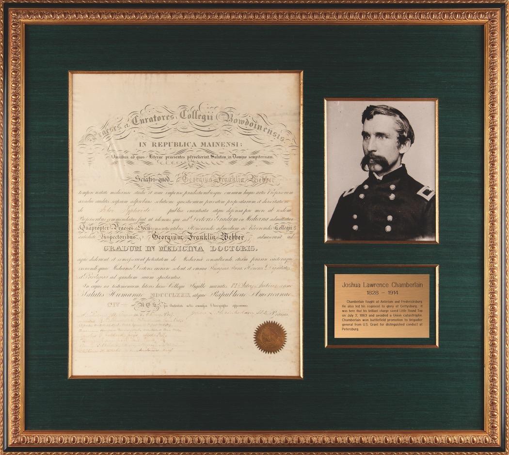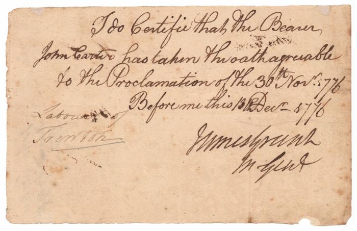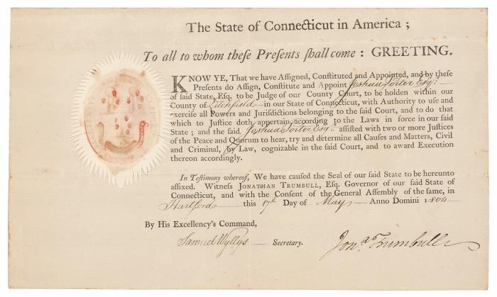1. George Washington Signed Revolutionary War Discharge Certificate (1783). Important Revolutionary War–dated partly-printed DS, signed “Go: Washington,” one page, 8.5 x 10, June 30, 1783. Continental Army military discharge headed “By His Excellency George Washington, Esq., General and Commander in Chief of the Forces of the United States of America.” In part: “These are to certify that the Bearer hereof Jean Baptiste Dupere, Soldier of the United States of America in General Hazen’s Regiment, having faithfully served in the United States five years and six months, and being inlisted for the War only, is hereby Discharged from the American Army.” Signed at the conclusion in ink by General George Washington, and countersigned below by Jonathan Trumbull, Jr. On the reverse is a statement noting that the certificate “shall not avail the Bearer as a Discharge, until the Ratification of the definitive Treaty of Peace,” and that he is to be considered on furlough until that time. In very good condition, with toning and soiling, foxing, and small areas of paper loss to the reinforced folds.