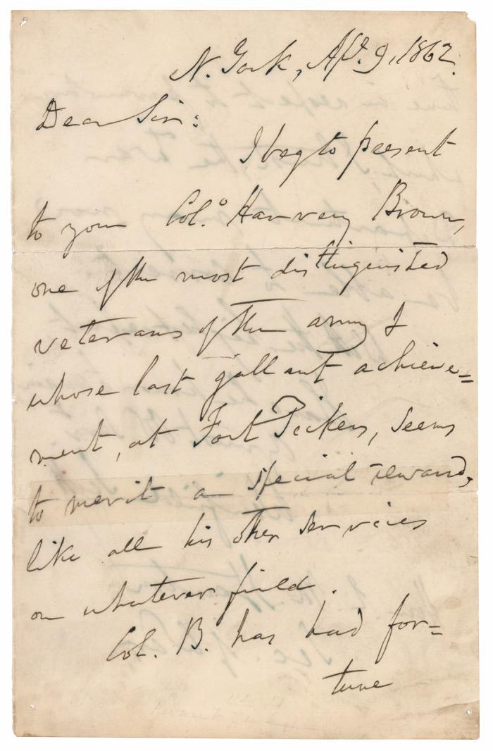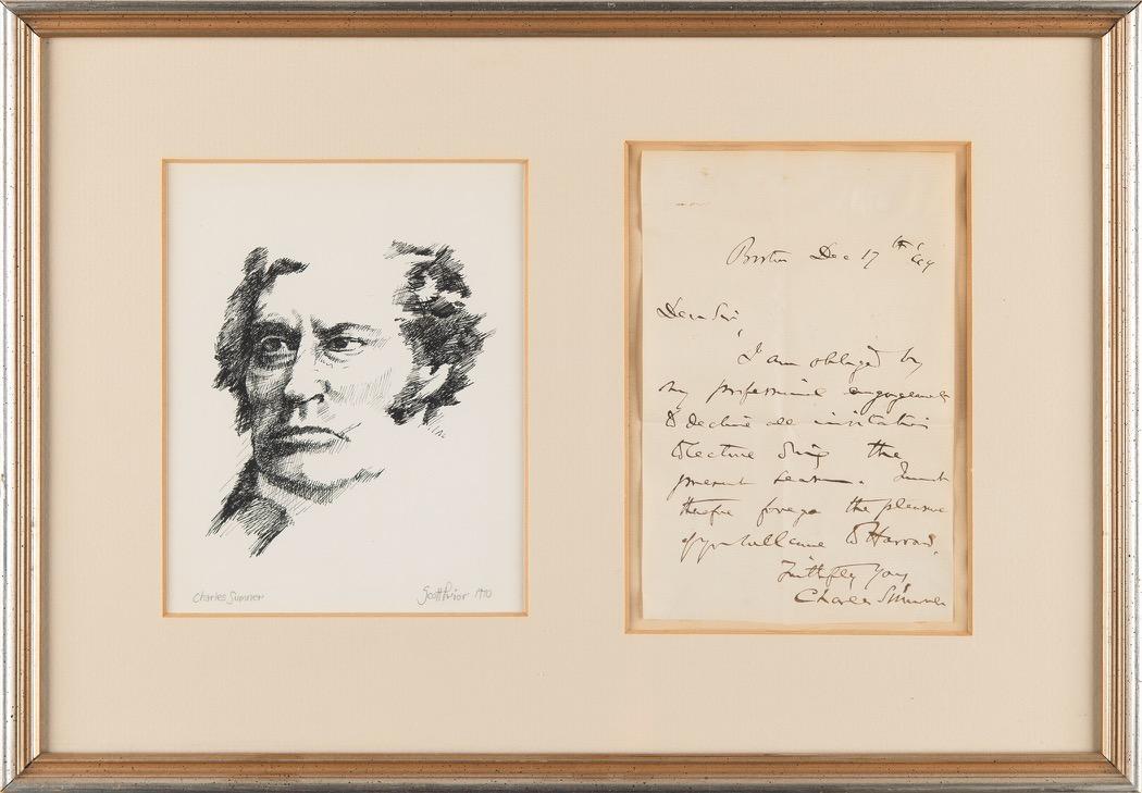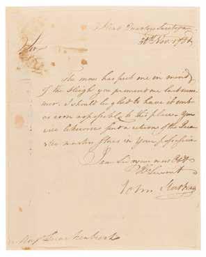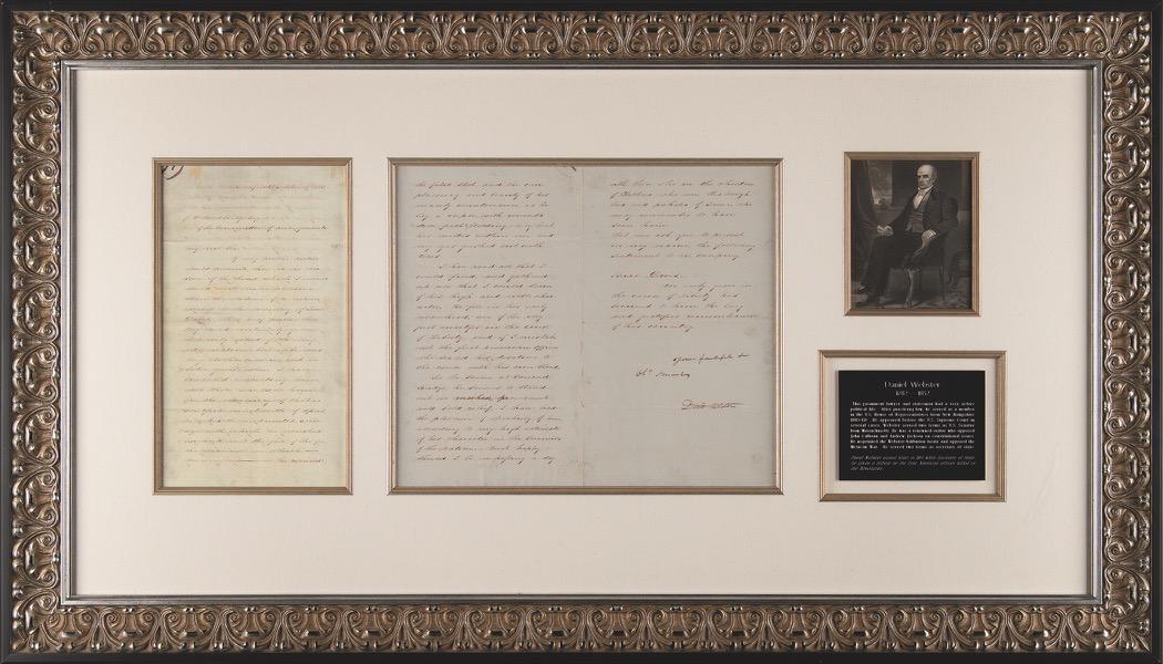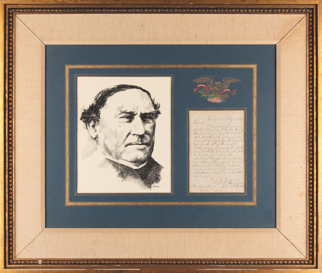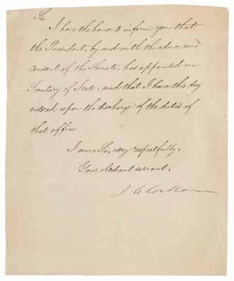 9. John Quincy Adams Autograph Letter Signed, Relating to the Loss of a Troop Transport Ship in the Second Seminole War. ALS signed “J. Q. Adams,” one page, 7.5 x 9.25, February 24, 1838. Handwritten letter to James Collier of Cohasset, Massachusetts, regarding a claim made on the War Department. In part: “I have submitted your Letter of the 6th inst. to the consideration of the Secretary of War, and have received an answer from him enclosing a report from the acting Quartermaster General T. Cross of the following report: ‘In reply to the Letter of Mr. James Collier referred to me by the War Department a few days since I have the honour to state that this office possesses no information whatever in relation to the loss of the ship Charles Wharton or the services alleged to have been rendered by the Schooner Rubicon. It appears however, by Mr. Collier’s own admission, that the Quarter Master at Tampa Bay, paid the captain of the Rubicon six hundred dollars, which it is a fair presumption of the value of his services.’ The fair presumptions of the Quarter Master General may doubtless be rebutted by positive testimony. If you have any such, I shall be happy to give any assistance in my power to exhibit the same before the proper department.” In very good to fine condition, with trimmed edges, overall staining, and complete backing. Starting Bid $200