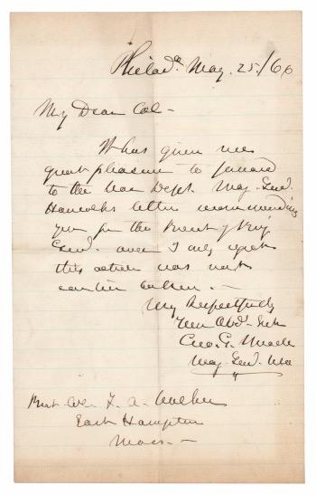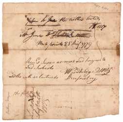 2. George Washington Hand-Addressed Envelope Panel. Extremely desirable envelope panel addressed entirely in the hand of George Washington, 6.25 x 3, no date but circa 1776, in full: “To the Hon. Ab’m Yates Esq’r, Presid’t of the Congress of the State of New York.” Affixed to a slightly larger sheet which bears a notation on the reverse by autograph dealer Walter R. Benjamin certifying the authenticity of the piece. In fine condition. Encapsulated in a PSA/DNA authentication holder. Accompanied by an engraved portrait with facsimile signature and a one-page ALS from Abraham Yates, signed “Abm. Yates, Jr.,” June 1, 1788, which contains “notes that I made this morning in Congress.” Abraham Yates became president of the New York Congress on August 28, 1776, and served in that role for only a month, presumably dating this piece to that historic year. Starting Bid $500