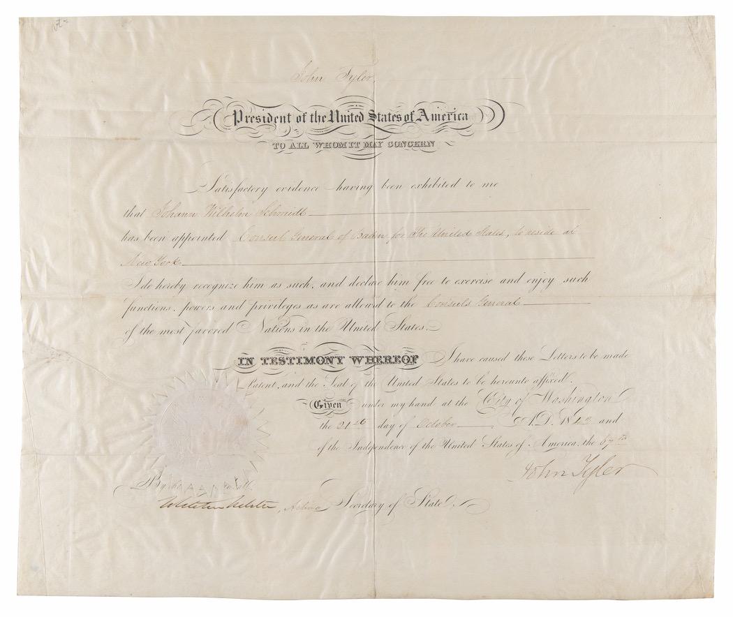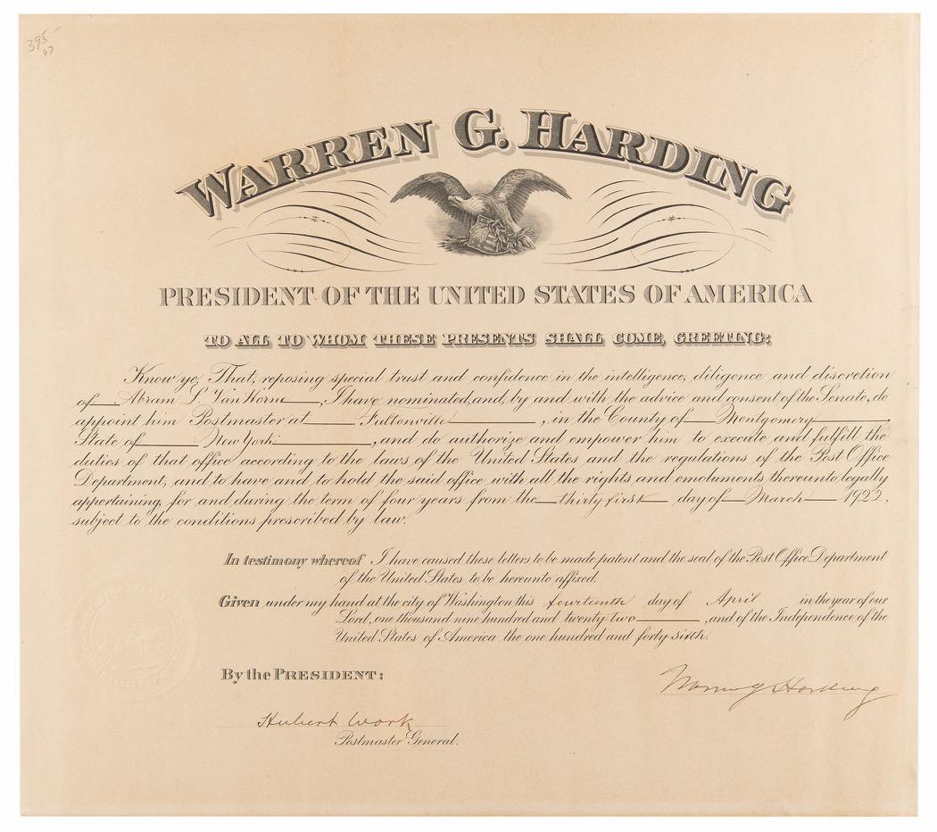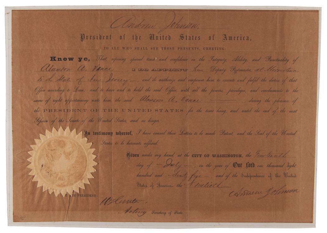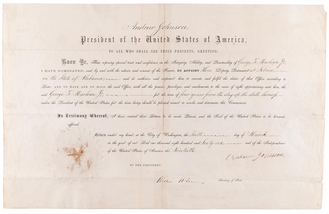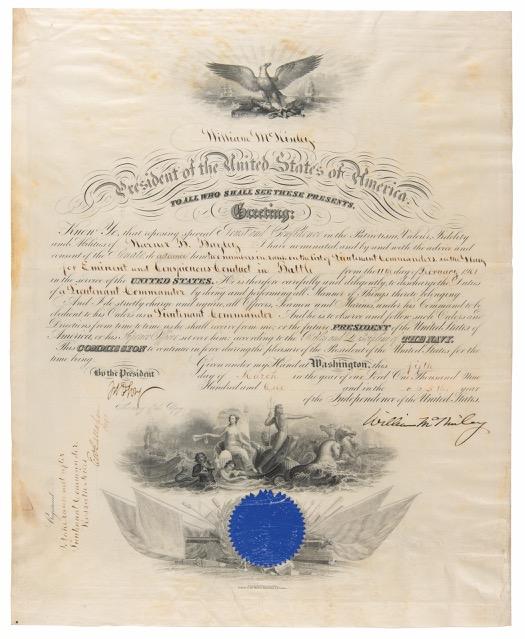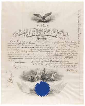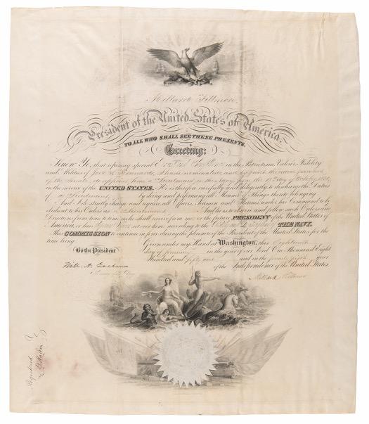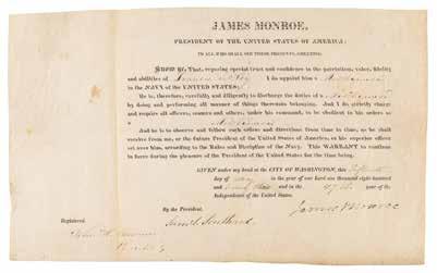 7. James Monroe Document Signed as President, Appointing “Francis S. Key” as Midshipman. Partly-printed vellum DS as president, one page, 13.25 x 8.25, May 15, 1823. President Monroe appoints “Francis S. Key” as “a Midshipman in the Navy of the United States.” Neatly signed at the conclusion in ink by President James Monroe, and countersigned by Secretary of the Navy Samuel L. Southard. In fine condition. According to the Naval Register, Francis S. Key, a citizen of the District of Columbia, was assigned to the West India squadron in 1825, and served aboard the Sloop Warren in 1827. An interesting document boasting an iconic name—perhaps a relation of Maryland lawyer, author, and poet Francis Scott Key, famed as the author of ‘The Star-Spangled Banner.’ Starting Bid $200