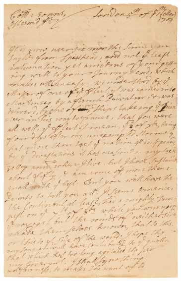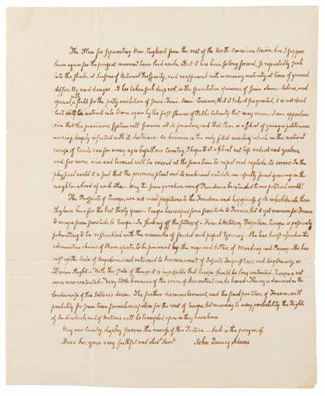 The Prospects of Europe, are not more propitious to the Freedom and happiness of its inhabitants, than they have been for the past thirty years—Europe has escaped from servitude to France, but it yet remains for France to escape from servitude to Europe. In shaking off the fetters of a French Military Despotism, Europe is passively submitting to be reshackled with the manacles of feudal and papal tyranny—she has burst asunder the adamantine chains of Buonaparte, to be pinioned by the rags and tatters of Monkery and Popery. She has cast up the Coda of Napoleon, and returned to her own vomit of Jesuits, Inquisitions, and Legitimacy, or Divine Right. With this state of things it is impossible that Europe should be long contented.” In fine condition. A long and important handwritten letter by John Quincy Adams, who would return to the United States one year later to assume the role of Secretary of State in Madison’s administration. Starting Bid $2500
