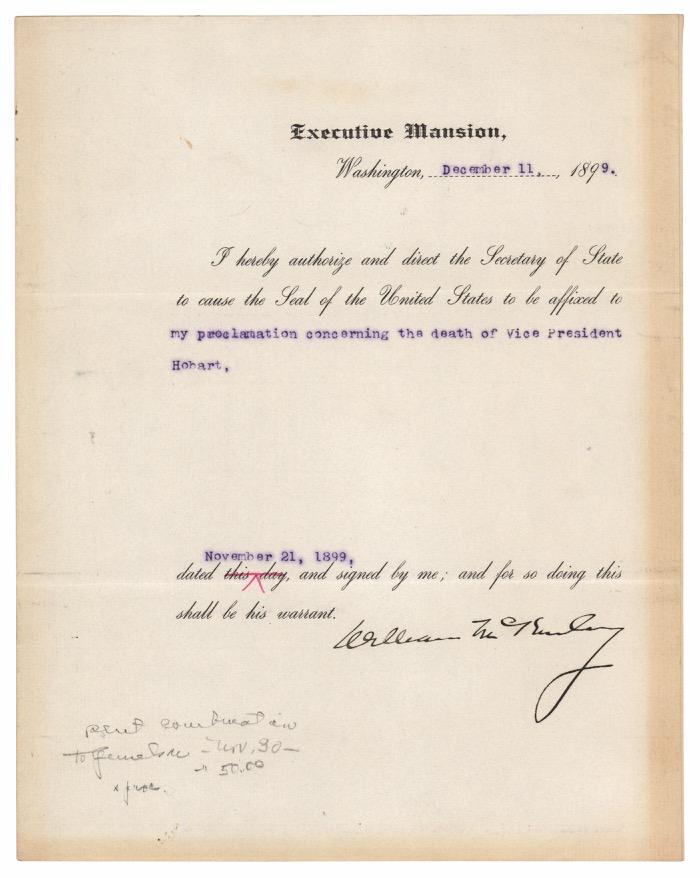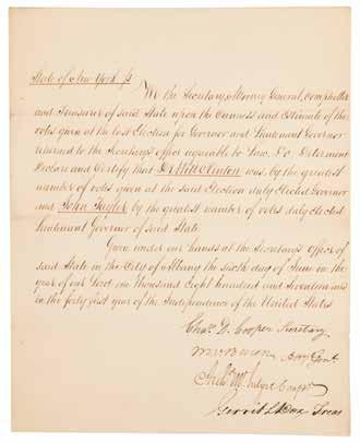 13. Martin Van Buren Document Signed, Certifying the Election of Governor DeWitt Clinton. Manuscript DS, signed “M. V. Buren Att’y Gen’l,” one page, 7.75 x 9.75, June 6, 1817. State of New York document certifying the election of DeWitt Clinton as governor. In part: “We the Secretary, Attorney General, Comptroller and Treasurer of said State upon the canvass and estimate of the votes given at the last Election for Governor and Lieutenant Governor returned to the Secretary’s office agreeable to Law, do, determine, declare and certify DeWitt Clinton was, by the greatest number of votes given at the said Election, duly elected Governor and John Tayler by the greatest number of votes duly elected Lieutenant Governor of said State.” Neatly signed at the conclusion in ink by Secretary Charles D. Cooper, Attorney General Martin Van Buren, Comptroller Archibald McIntyre, and Treasurer Gerrit L. Dox. In fine condition. Starting Bid $200