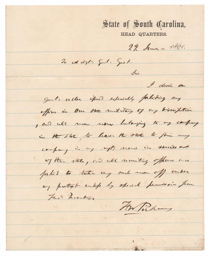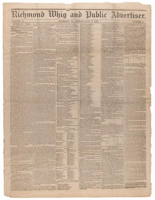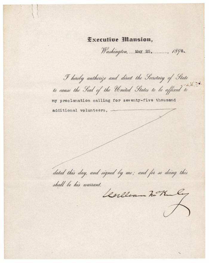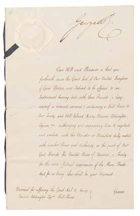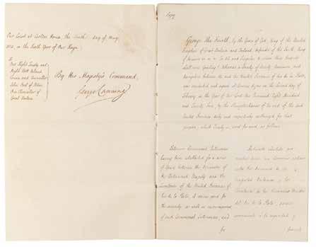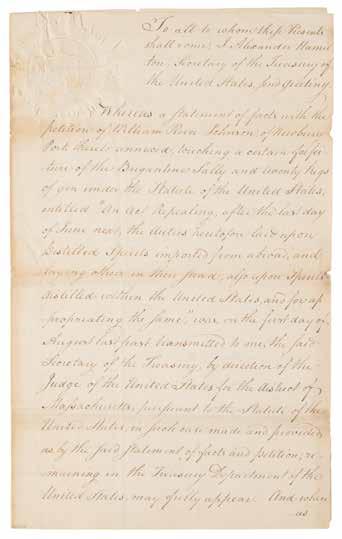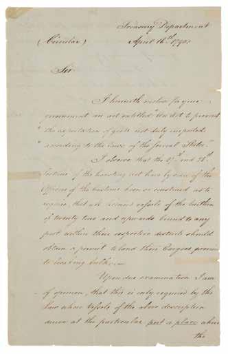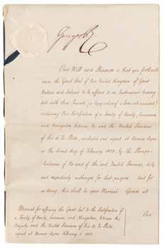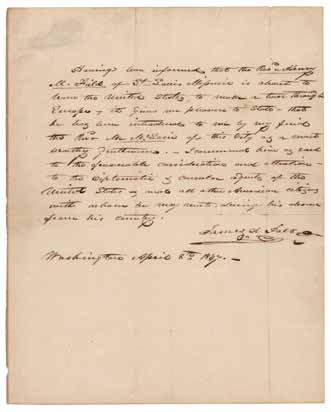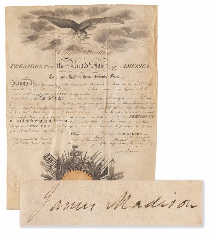 6. James Monroe Document Signed as Secretary of State, Giving Instructions for Engaging the Enemy. Partly-printed DS as Secretary of State, signed “Jas. Monroe,” three pages on two adjoining sheets, 7.75 x 12.75, June 26, 1812. Important privateering document issued at the beginning of the War of 1812, containing “Instructions for the Private Armed Vessels of the United States.” The first sheet features the printed “Act concerning Letters of Marque, Prizes and Prize Goods,” and the second has instructions to privateers. In part: “The high seas, referred to in your commission, you will understand, generally, to extend to low water mark…You are to pay the strictest regard to the rights of neutral powers, and the usages of civilized nations… Towards enemy vessels and their crews, you are to proceed, in exercising the rights of war, with all the justice and humanity which characterise the nation of which you are members…The master and one or more of the principal persons belonging to captured vessels, are to be sent, as soon after the capture as may be, to the judge or judges of the proper court in the United States.” Neatly signed at the conclusion by Secretary of State James Monroe. In very good to fine condition, with scattered staining, and archival repairs to tears and fold splits. Starting Bid $500
