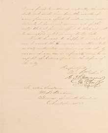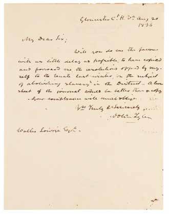 Following his 1831 election to Congress, former president John Quincy Adams initiated an extensive petition campaign in protest of the continuation of slavery in Washington, D.C. As chair of the Committee on the District of Columbia, Tyler was shocked and outraged when northern abolitionists launched their campaign for the exclusion of slavery from the district. In 1835, Tyler offered a resolution arguing that abolishing slavery in Washington ‘without the consent of the owners, would be unjust and despotic, and in violation of the Constitution of the United States.’ At the time of the present letter, Tyler had resigned from Congress and was vying for the vice presidency as a Whig in the 1836 election: in the aftermath of the Nat Turner’s Rebellion and other events, slavery emerged as an increasingly prominent political issue, and the Whigs opposed federal intervention into the issue of slavery. Starting Bid $200
