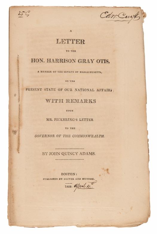 8. John Quincy Adams Autograph Letter Signed on War of 1812: “Europe is passively submitting to be reshackled with the manacles of feudal and papal tyranny”. ALS, three pages on two adjoining sheets, 8 x 9.75, April 14, 1816. Lengthy handwritten letter to Samuel Dexter, who had been Secretary of War and Secretary of the Treasury during the administration of John Quincy Adams’ father, John Adams. In this intimate and personal letter, Adams offers his view on the War of 1812, its effects on American and European character, opposition to the war efforts, his negotiations to end the war, and the future of Europe. During this period, Adams was serving as United States Minister to the United Kingdom, and had been a part of the American delegation that negotiated the end to the War of 1812.