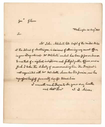 Letter Signed as Secretary of State. ALS as Secretary of State, signed “J. Q. Adams,” one page, 8 x 10, August 20, 1818. Handwritten letter to General George Gibson, recommending John Mitchell for a vacancy. In part: “Mr. John Mitchell, late Consul of the United States at the Island of Martinique, is desirous of obtaining any vacant office in your Department. Mr. Mitchell’s conduct has been so far as known to me that of a vigilant, industrious and faithful public officer and as such I take the liberty of recommending him. The President is well acquainted with Mr. Mitchell’s character and services and has expressed himself favorably disposed toward him.” In fine condition, with archival reinforcement along the inner hinge, and some light toning to the lower fold and the left edge. Starting Bid $200