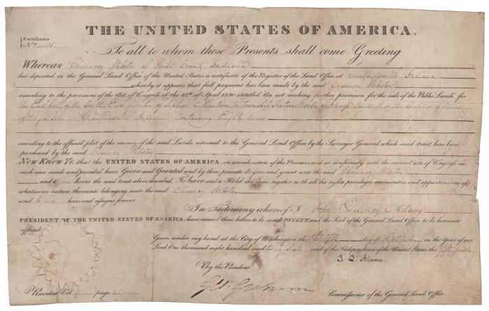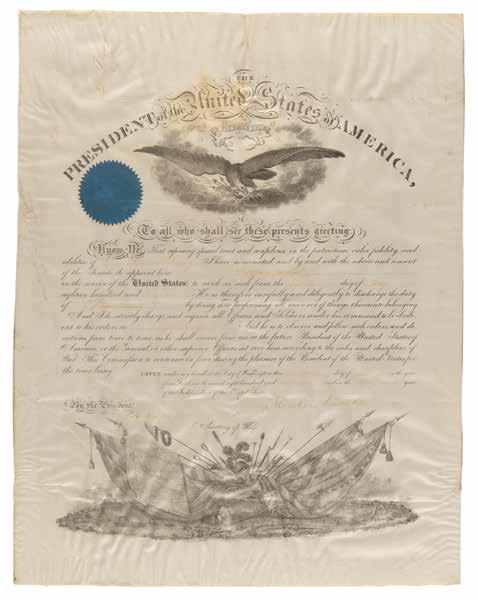 3. John Adams Document Signed as President. Partly-printed vellum DS as president, one page, 15 x 12.25, October 3, 1800. President Adams appoints Isaac Randall “to be a second Lieutenant of a company of volunteer Infantry in the Provisional Army, who have associated, at the Town of Durham and its vicinity in the State of Massachusetts and offered themselves, for the service of the United States.” Boldly and prominently signed at the conclusion in ink by President John Adams, and countersigned by Secretary of War Samuel Dexter. The white paper seal affixed at the upper left remains intact. In very good to fine condition, with light staining along the intersecting folds, and minor loss to the lower right corner. Starting Bid $500