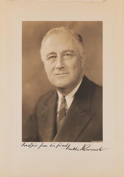31. Franklin and Eleanor Roosevelt Signed Photograph as President and First LadyRare Dual-Signed 1941 Christmas Portrait from the White House. Scarce vintage mattefinish 9.25 x 7.5 photo of Franklin and Eleanor Roosevelt relaxing on the south porch at Hyde Park on July 4, 1941, signed in fountain pen as president, “Franklin D. Roosevelt,” and as first lady, “Eleanor Roosevelt,” with “Christmas 1941” added in calligraphy as originally produced for the White House and President Roosevelt in 1941. Nicely double-matted and framed to an overall size of 17.75 x 15.75. In very good to fine condition, with light silvering and somewhat irregular discoloration to the image, and Eleanor’s signature very faded but still legible. This rare format marked the first occurrence of the president and first lady taking the time to hand-sign official White House Christmas presents for the executive staff at the White House. Starting Bid $200