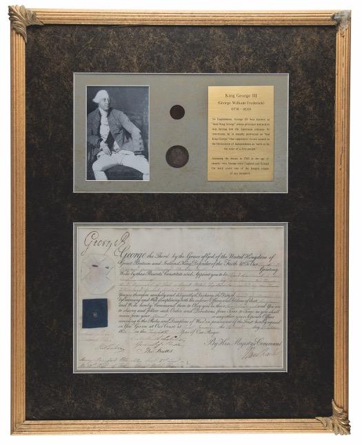 4. John Adams Twice-Signed Legal Document (1773). Revolution-dated partly-printed DS, signed twice as “John Adams” and Adams,” one page both sides, 7.75 x 12.75, August 28, 1773. Notice to the Sheriffs of Suffolk and Essex County to have Andrew Oliver of Salem appear in court, in part: “In a Plea of Debt, for that said Andrews…together with Martha Allen Widow and Thomas Hubbard Esquire, since deceased, by their Bond under their hands…unto Thomas Hutchinson…in the sum of Fifteen Thousand Pounds of lawful money, to be paid to the said Thomas Hutchinson…yet the said Andrew Oliver, Martha Allen and Thomas Hubbard never paid.” Signed on the reverse by John Adams below a handwritten statement, and then again in the upper left corner, writing only his endorsed surname. The document is also signed twice by well-known attorney Samuel Quincy, who faced off against Adams just three years prior as head counsel for the prosecution in the Boston Massacre trial. Archivally matted and framed along with two commemorative plates, a copy of the front of the document, and a reprinted congressional document to an overall size of 33 x 42. In very good to fine condition, with light toning and scattered small stains. Starting Bid $300