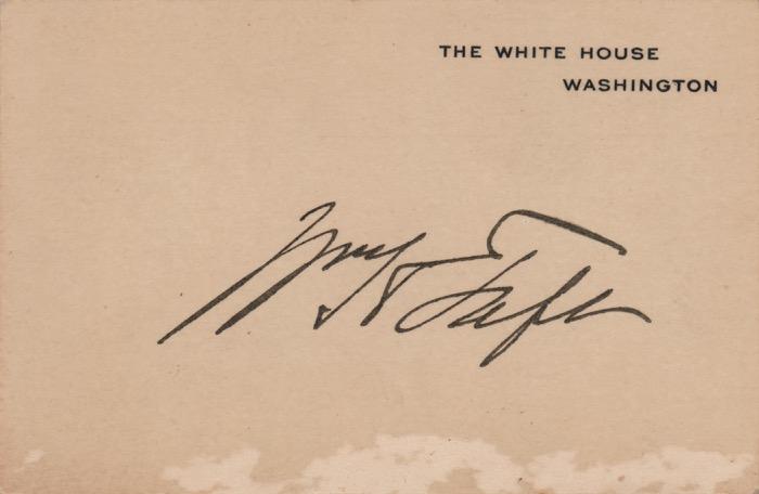 33. Franklin D. Roosevelt Signed White House Card: “For my old friend Farmer Stinky—may he raise more & more dirt & hell”. Choice White House card, 4 x 2.5, boldly signed and inscribed in ink by President Franklin D. Roosevelt, “For my old friend Farmer Stinky—may he raise more & more dirt & hell. F.D.R.” In very fine condition. Accompanied by the original White House envelope. A fun and unusual inscription from the typically reserved New Yorker. Starting Bid $200