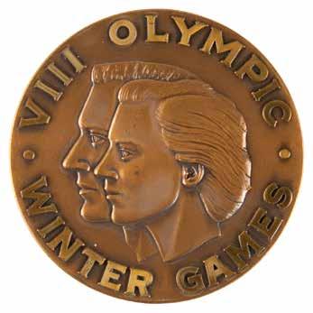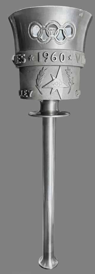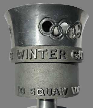 3004. Squaw Valley 1960 Winter Olympics Torch. Excessively rare official torch of the Squaw Valley 1960 Winter Olympics, marked as number “10” on the bottom of the handle, comprised of silver aluminum and measuring 19˝ long, considered to be among the rarest and most valuable of all Olympic torches. Inspired by the Ralph Lavers design of the torches used in 1948 and 1956, this torch was designed by legendary Disney ‘imagineer’ John Hench, and features three Olympic rings cutouts around the bowl, above a circular legend: “VIII Olympic Winter Games.” Below is the Squaw Valley Games emblem between two branches and the legend “Olympia to Squaw Valley.” The burner wick remains in place. The torch exhibits some minor scuffing to the bowl and handle. Consignor notes that this was acquired from the estate of a California state employee who was responsible for for the safety of the of the torch runners.