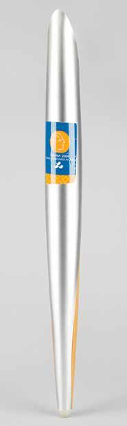 3028. Athens 2004 Summer Paralympics Torch. Official 2004 Athens Summer Paralympics torch, constructed of aluminum and olive wood, measuring 25.75˝ in length and 2.25˝ at its widest point, designed by Andreas Varotsos and manufactured by GA & L Harrington. The torch was modeled to reflect the simple and congruous lines of an olive tree leaf, with the union of wood and metal evoking the different colors found on either side of the leaf, and the ergonomic design representing the extension of the moving flame. The front of the aluminum sheath bears a label of the 2004 Paralympics emblem, which bears a few scratches. Starting Bid $200