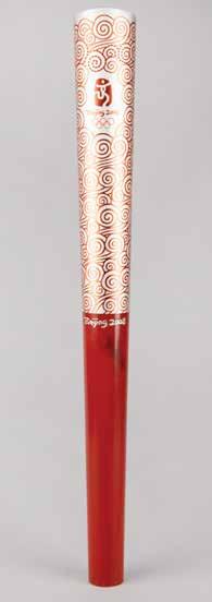 3031. Beijing 2008 Summer Olympics Torch. Unused official 2008 Beijing Summer Olympics torch, constructed of anodized aluminum and rubber, the torch measures 28.5” in length, 3” at its widest point, and was designed by Lenovo China and Aerospace Science & Industry, and manufactured by Zhongshan Vatti Gas Appliance Stock Co., Ltd. The curved shape of the torch embodies that of both a parchment scroll and a cloud, the latter an ancient decorative element from Chinese art that is found on buildings, sculptures, and furniture. The upper portion of the torch is covered in etched patterns of ‘propitious clouds’ and bears the Beijing logo and Olympic rings; its red color symbolizes the spirit of celebration, enthusiasm, and good fortune. The lower handle portion is inscribed “Beijing 2008,” and is layered with a fine rubber-based varnish, a finish specifically designed to improve grip and replicate the contact of human skin as if the torchbearer were holding a friend’s hand. The torch bears a couple of small scuffs, and an area of discoloration is present to the handle. Complete with its original Olympic box. Starting Bid $200