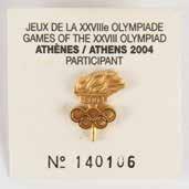 3029. Athens 2004 Summer Olympics Torch. Official 2004 Athens Summer Olympics torch, constructed of aluminum and olive wood, measuring 25.75” in length and 2.25” at its widest point, designed by Andreas Varotsos and manufactured by GA & L Harrington. The torch was modeled to reflect the simple and congruous lines of an olive tree leaf, with the union of wood and metal evoking the different colors found on either side of the leaf, and the ergonomic design representing the extension of the moving flame. The front of the aluminum sheath bears the Olympic rings and Athens emblem, with Greek engraving below presented to Lena Zachopoulou. The Olympic flame was lit in Olympia, Greece, on March 25, 2004, and proceeded on a five-continent journey that witnessed the torch pass by all the cities that had hosted the Games since 1896, as well as marking the flame’s debut in Africa, India, and South America. In total, the torch covered over 84,000 km during its 141-day journey. Starting Bid $200