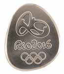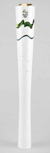 3036. Rio 2016 Summer Olympics Torch. Unused official 2016 Rio de Janeiro Summer Olympics torch, constructed of recycled aluminum and colored resin, measuring 27” in length and 3.5” at its widest point, designed by Sao Paulo studio Chelles & Hayashi and manufactured by Recam Laser. The torch features a white body that automatically expands upon being lit to reveal multicolored segments drawn from the hues of the Brazilian flag, representing the natural wonders surrounding the host city. The top is adorned with the Rio Olympic emblem, which bears some light flaking. Includes the original presentation tube and drawstring carrying bag. More information online at www.RRAuction.com.. Starting Bid $200