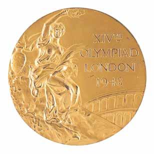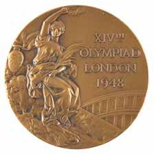 3002. London 1948 Summer Olympics Torch. Historic official 1948 London Olympics torch, comprised of aluminum alloy, measuring 16” in length and 5” at its widest point, designed by Ralph Lavers. The upper part is designed in the shape of a cauldron with three ‘cut-outs’ of the Olympic rings, encircled below by the inscription, “Olympia to London, with thanks to the bearer: XIVth Olympiad 1948.” Includes its black burner cup. The torch exhibits scattered light scuffs and dings.