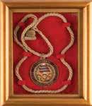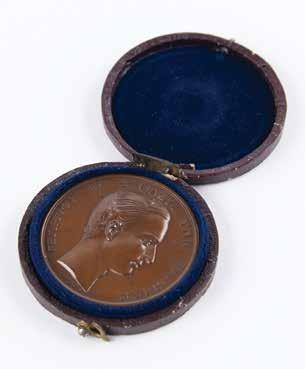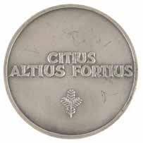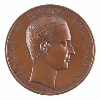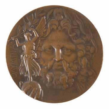 3041. Athens 1870 Zappas Olympics Bronze Winner’s Medal in Original Box. Scarce winner’s medal issued for the 1870 Zappas Olympics in Athens. Bronze, 41 mm, 34 gm, by Albert Désiré Barre; manufactured by the Paris Mint. The front depicts a relief bust of King George of Greece encircled with Greek text: “George the First, King of the Hellenes”; the reverse features a laurel wreath with legend: “Olympia, at Athens, 1870,” with surrounding inscription: “Organizer of the Games Evangelis Zappas.” Stamped “Cuivre” on the edge. Complete with its rare original circular case, broken at the hinge.