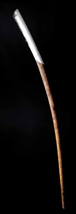 3021. Lillehammer 1994 Winter Olympics Torch. Magnificent official Lillehammer 1994 Winter Olympics torch, constructed of wood, iron, and copper, measuring an impressive 60″ in length, designed by André Steenbuch Marandon and Paal Christian Kahrs, and manufactured by Paal J. Kahrs Arkitekter AS. Resembling that of a sheath knife, the torch is highlighted by its long birchwood handle that symbolizes Norwegian tradition, with the upper section consisting of a polished aluminum blade that conversely reflects the nation’s industrial modernity and technology. The base of the burner is engraved with the logo of the XVII Olympic Winter Games, and the upper and lower sections of the inner copper plate feature several event pictograms. To contrast its martial appearance, the torch’s supple elongated shape and considerable length were chosen with the view of forming a harmonious extension between the torch and its bearer—its creators bestowed it with the poetic name ‘Noble.’ The bottom of the handle is marked “125.” Exhibiting general wear from use, this is a superb example of a most desirable torch.
