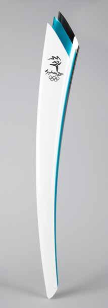 3026. Sydney 2000 Summer Olympics Torch. Unused official 2000 Sydney Olympics torch, comprised of steel and aluminum, measuring 30.5˝ in length and 4˝ at its widest point, designed by Blue Sky Design and manufactured by G. A. & L. Harrington. The beautiful aesthetic of this torch drew inspiration from the Sydney Opera House, the blue of the Pacific Ocean, and the Australian boomerang. Both sides of the top of the torch prominently feature the emblem of the Sydney Olympics. The Sydney Olympic Games were lauded as the best ever held and the torch relay was a massive undertaking, taking place over the course of four months and including a total of 13,400 torchbearers. A beautiful torch from the XXVII Olympiad. Starting Bid $300