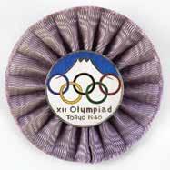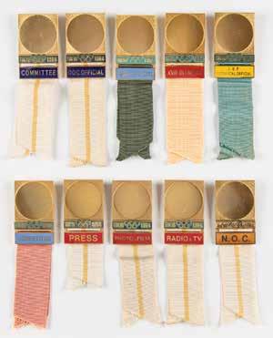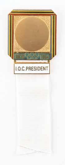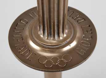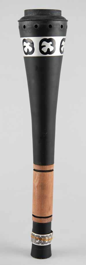 3008. Mexico City 1968 Summer Olympics ‘Type 4’ Torch. Official ‘Type 4’ torch from the Mexico 1968 Summer Olympics, constructed of black aluminum and a wooden handle, measuring 20.5” in length and 4” at its widest point. The upper metal ring features a pattern of six doves and the metallic label at the bottom reads “Mexico” twice. The base of the handle bears an affixed label that features the logo of the Games and names the designer, Manuel Villazon. The lower black base is loose from the torch, as are its two metallic “Mexico” labels, which are kept together with an elastic band. Includes the original pink-andturquoise tube, which features slight wear, including some rusting to the end caps. The torch relay for the Mexico 1968 Summer Games recreated the route taken by Christopher Columbus to the New World, and began on August 23, 1968, in Olympia, Greece. It notably traveled through Columbus’s birthplace in Genoa, where he set sail from Palos in Spain, and the first land he reached in San Salvador. In all, there were 2,778 torchbearers on the 13,546 km route. Starting Bid $200