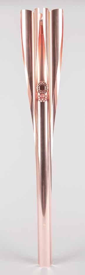 3038. Tokyo 2020 Summer Olympics Torch. Official Tokyo 2020 Summer Olympics torch, constructed of recycled aluminum from temporary housing used after the Fukushima, Japan, disaster in 2011. Designed by Tokujin Yoshioka and inspired by Japanese cherry blossoms, the torch measures 28” long and 4.5” at its widest point. Finished in a ‘sakura’ rose-gold color, the torch has a fluted design featuring five petal-shaped columns around the tip, with the “Tokyo 2020” wreath emblem and Olympic rings on the front. The five separate flames from the ‘flower petals’ come together as one at the center of the torch to give off a brilliant light known as the ‘Path of Hope.’ The torch is missing its bottom cap. Includes its original storage cylinder.