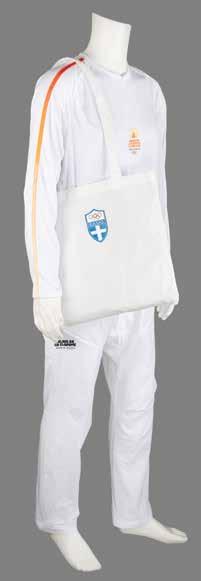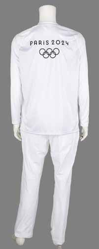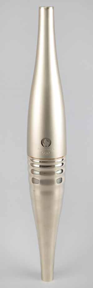 3040. Paris 2024 Summer Olympics Torch and Torchbearer’s Uniform. Incredibly rare official Paris 2024 Summer Olympics torch—the first to be offered at auction—constructed of recycled steel, designed by Mathieu Lehanneur and manufactured by ArcelorMittal, featuring a perfectly symmetrical, flowing design that draws inspiration from three themes of Paris 2024: equality, water, and peacefulness. The torch measures 27.5˝ long and 4˝ at its widest point: the upper half sports a matte finish on a plain surface, with the Paris 2024 insignia and five Olympic rings below; the lower half features a reflective finish on a rippled surface, inspired by the serenity of the water on the majestic River Seine. In total, only 2,000 torches were produced by ArcelorMittal, five times less than what was used at other recent Games.