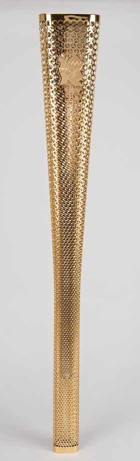 3034. London 2012 Summer Olympics Torch. Beautiful unused official 2012 London Olympics torch, comprised of metal and aluminum, measuring 31.5” in length and 4.25” at its widest point, designed by Edward Barber and Jay Osgerby, and manufactured in collaboration by Tecosim, LPG Gas, Bullfinch and Premier Sheet Metal. The gold-colored torch body consists of two envelopes of aluminum alloy perforated with 8,000 circles, a number which matches with both the amount of torchbearers and the United Kingdom relay miles, and features a golden metal logo of the Games near the top. The triangular shape refers to the multiples of three found in the Olympic movement’s values of excellence, friendship, and respect, the Olympic motto of ‘Citius, Altius, Fortius,’ and London’s hosting of the Games for the third time.