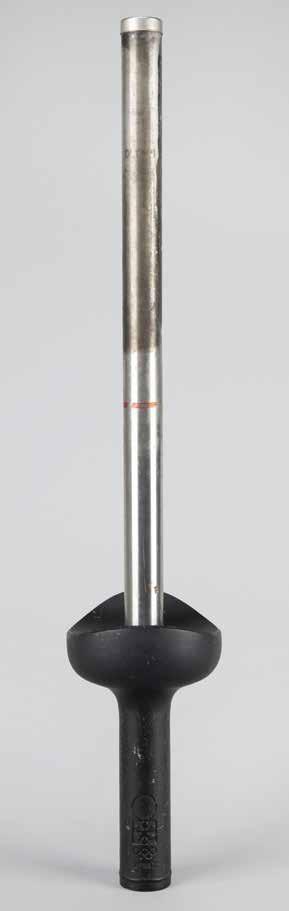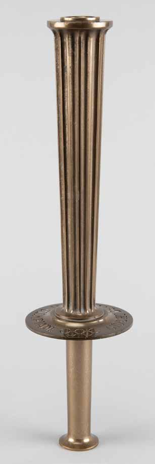 3009. Sapporo 1972 Winter Olympics Torch. Official 1972 Sapporo Winter Olympics torch, consisting of a cast-blackened aluminum alloy bowl and a stainless steel combustion tube, measuring an overall 25.5˝ in length and 4.75˝ at its widest point, manufactured by Nippon Koki. The torch’s designer, Sori Yanagi, was a pioneer of Japanese industrial design, whose simplistic and pure use of lines and curves were regarded as patently Japanese as they were universal. Inspired by the shape of the Olympic cauldron, this classic torch features a slender black bowl, with the handle impressed with the Sapporo Games logo, and the bottom engraved “Nikkei” and “Yanagi”; lower portion of the tube also bears the Sapporo Games logo, with the manufacturer’s stamp below, “GD Nippon Koki Co., Ltd.” Both the black bowl and tube exhibit moderate-toheavy wear from use, with various nicks, scuffs, and scratches to handle, the upper portion of the tube charred and blackened, and worn markings on the tube.