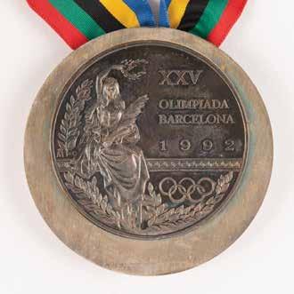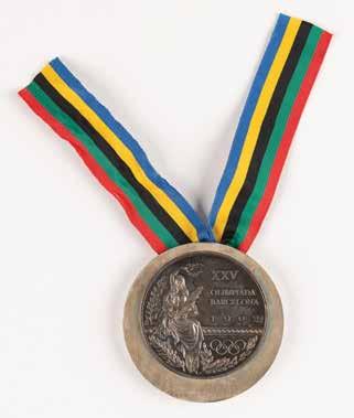 3020. Barcelona 1992 Summer Olympics Torch. Official 1992 Barcelona Olympics torch, comprised of aluminum and plastic, measuring 26” in length and 7” at its widest point, designed by Andre Ricard. The metal body is inscribed in gold text, “XXV Olimpiada Barcelona 1992,” and bears the emblem of the Games. The sliding red switch to reverse is engraved “000095.” Exhibits scuffs, scratches, and marks to the rubberized handle, and a few scuffs to the upper body. The massive fifty-day relay included nearly 9,500 torchbearers who carried the Olympic flame by foot and bicycle for a total of 5,940 km throughout Spain. The lighting of the cauldron at the opening ceremonies was especially memorable, as Paralympic archer Antonio Rebollo ignited the cauldron by shooting an arrow lit from the Olympic flame. Starting Bid $200