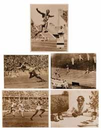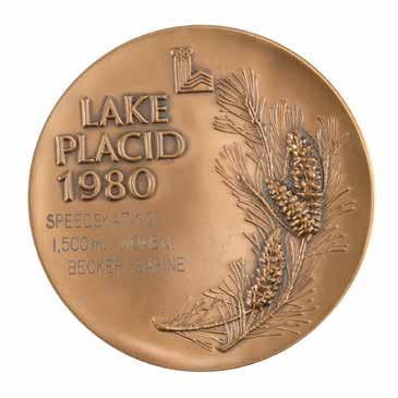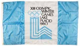 Additionally includes several uniform pieces and souvenirs issued to DeForrest Jackson to commemorate his role as a member of the Lake Placid 1980 Olympic Torch Relay Team: a thick, bright yellow winter jacket featuring a “XIII Olympic Winter Games Lake Placid 1980” embroidered patch on the chest, with matching winter overalls and a pair of gloves, all made by Asics; a “Lake Placid 1980 Olympic Torch Relay Team” tank top with matching running shorts, both made by Asics; a large 5’ by 3’ blue-and-white flag of the Lake Placid 1980 Olympic Winter Games; and an official nickel-silver participation medal issued for the Lake Placid 1980 Winter Olympics, housed in its original hinged case, featuring modernist relief views of the nine winter sports on the front, with Lake Placid Games emblem encircled by the raised words of the Olympic oath in four concentric circles on the reverse. Also accompanied by photocopies of three newspaper articles about DeForrest Jackson’s participation in the Lake Placid 1980 torch relay.