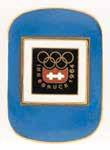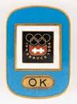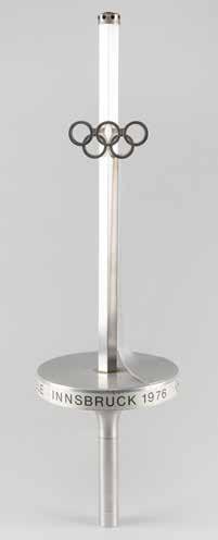 3011. Innsbruck 1976 Winter Olympics Torch. Extremely rare official 1976 Innsbruck Winter Olympics torch, constructed of aluminum alloy and steel, measuring 29” in length and 8.25” at its widest point, designed by Vereinigte Metallwerke Ranshofen Berndorf. The upper shaft of the torch is hexagonal and features a pair of Olympic rings in openwork, with an elegantly curved metal strip extending from rings to platform representing a ski jump. The rim of the platform features a label inscribed with Olympic rings and “XII. Olympische Winterspiele Innsbruck 1976.” The handle’s base bears a manufacturer’s label, and the top retains its original cap. The shaft, platform, and handle exhibit some mild light marks and discoloration.