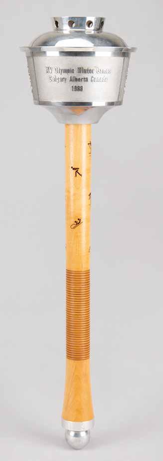 3017. Calgary 1988 Winter Olympics Torch. Official 1988 Calgary Olympics torch, comprised of aluminum with a maple handle, measuring 23.5” in length, emblazoned on the handle with pictograms of ten Winter Olympic sports. The top is inscribed, “XV Olympic Winter Games Calgary Alberta Canada 1988,” and the ball at the bottom is engraved with the Olympic motto, “Citius, Altius, Fortius.” This unused torch, which is missing its fuel canister with wicks, bears trivial hints of tarnishing. The torch was designed to resemble the Calgary Tower, an iconic landmark in the Canadian city. Unlike many relays, the torches were shared and thus only about 100 were manufactured. Starting Bid $1,000