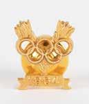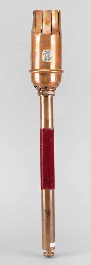 3007. Grenoble 1968 Winter Olympics Torch. Excessively rare official torch of the Grenoble 1968 Winter Olympics. One of just 33 manufactured by the Société Technique d’Equipement et de Fournitures Industrielle (STEFI), the torch is comprised of a handsome rose-gold bronze alloy with a red felt-wrapped grip. It measures 30˝ in length, 4˝ at its widest point, and weighs 3.6 lbs. The torch features a long, narrow combustion chamber with a crenelated upper section representing the flame. The sides of the burner head are decorated with three silver plaques featuring the Grenoble emblem designed by Roger Excoffon, depicting the Olympic rings surmounted by a snowflake, and encircled by the text, “Xes Jeux Olympiques d’Hiver, Grenoble 1968.” A small label is affixed to the bottom of the handle and the torch bears areas of oxidation and discoloring. Per the consignor, the original owner of this Grenoble torch installed and managed the gas equipment instrumental to the lighting of the Olympic flame during the opening ceremony. A magnificent opportunity to claim one of the rarest and most sought-after Olympic torches ever made.