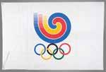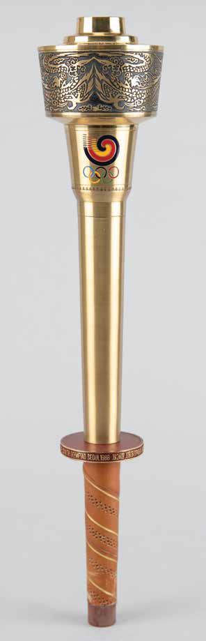 3018. Seoul 1988 Summer Olympics Torch. Beautifully designed official 1988 Seoul Olympics torch, constructed of metal, copper, leather, and plastic, measuring 20” in length and 4” at its widest point, designed by Lee Woo-Sung and manufactured by Korea Explosives Co. Ltd. The handle is wrapped in brown leather with a ring above, inscribed, “Games of the XXIVth Olympiad Seoul 1988,” in English and Korean. The upper portion of the torch bears a colorful Olympic ring emblem and the top is engraved with an intricate dragon design symbolizing the harmony between East and West; based on the Chinese zodiac, the year 1988 was also the year of the dragon. The torch’s burner is absent, and the torch exhibits scattered light wear and scuffs to the body and leather. During the 22-day relay, the Olympic Flame traveled from the Greek capital of Athens to Korea’s southernmost point, Jeju Island, before making its way north to Seoul in a 4,167 km relay. Starting Bid $300