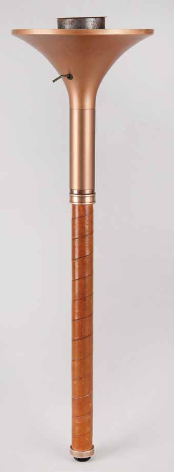 3013. Lake Placid 1980 Winter Olympics Torch, Carried by Georgia’s Relay Runner. Rare and unusual 1980 Lake Placid Olympics torch carried by DeForrest Jackson as Georgia’s runner in the official torch relay, comprised of bronze-colored leather and metal, measuring 28.5˝ in length and 8.5˝ at its widest point, designed by Don McFarland and manufactured by Cleanweld Turner. The torch design and materials symbolized a blend of modern technology and a reference to Ancient Greece. The central ring lacks the Lake Placid emblem and text seen on many torches, as issued for this variant; the torch bowl also has a rare metal switch seen on few other examples of Lake Placid 1980 Winter Olympic relay torches, evidently designed to control the burn rate. The bottom brass ring, which exhibits some light wear, is engraved with the maker’s information, “Cleanweld / Turner, Sycamore, Illinois” and marked “102.” The burner bowl remains in place. The torch exhibits some wear and scuffing to its leather-wrapped handle, as well as general overall wear from use in the relay.
