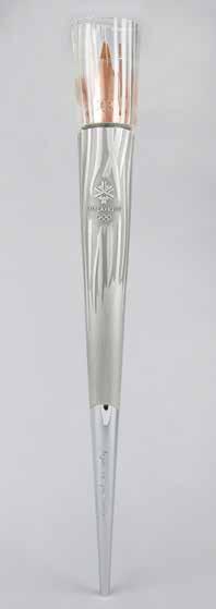 3027. Salt Lake City 2002 Winter Olympics Torch. Unused official 2002 Salt Lake City Winter Olympics torch, constructed of silvered metal and copper, measuring 31.5” in length and 3.5” at its widest point, designed by Axiom Design and manufactured by Coleman. The torch was modeled after an icicle and slightly curved to represent speed and fluidity, with a contrasting dull and polished finish on the handle to represent the meeting of modernity with the past. The handle is engraved with the motto of the games, “Light the fire within,” and a raised emblem of the games appears near the top. The torch bears trivial marks and wear. A desirable example as it is complete with its fragile glass bowl. The Olympic flame was lit in Olympia, Greece, on November 19, 2001, and began the American leg of its journey on December 4 in Atlanta. The route passed through the past host cities in the United States—Atlanta, Lake Placid, St. Louis, Los Angeles, and Squaw Valley—over a 21,725 km route. Starting Bid $200