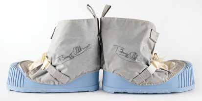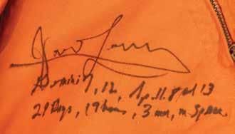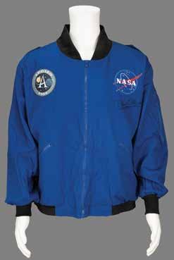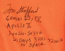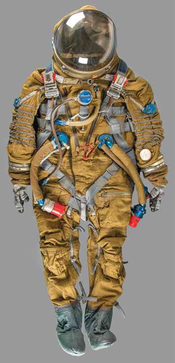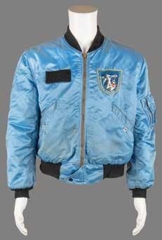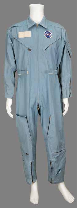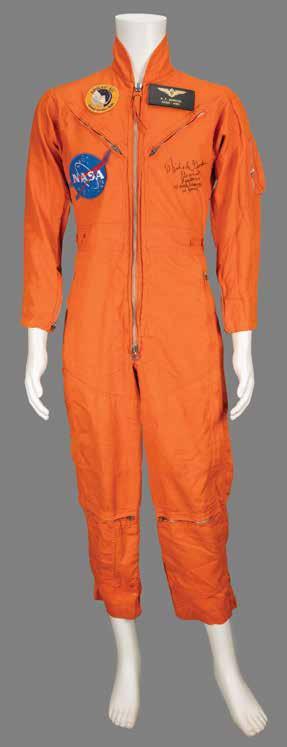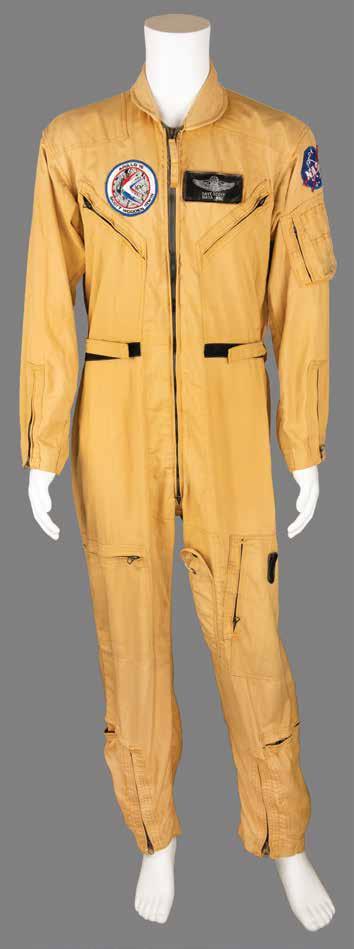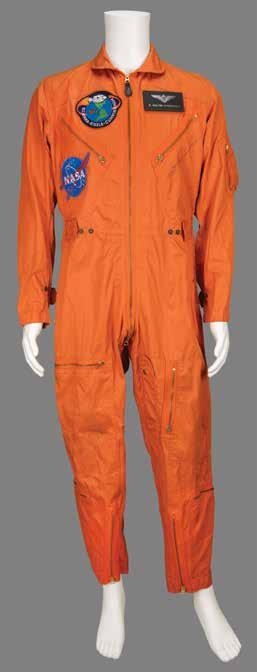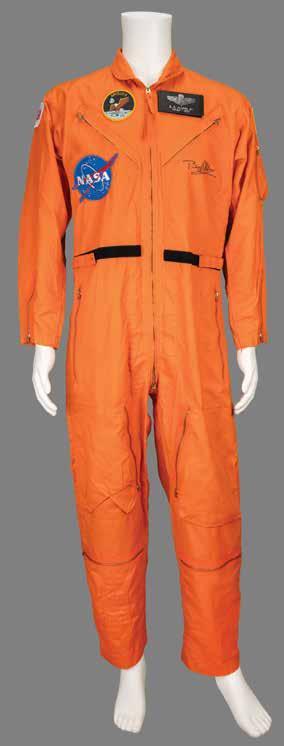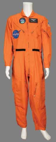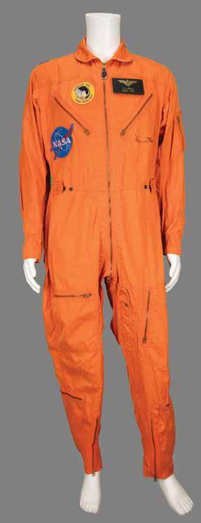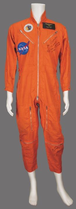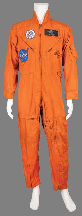 4009. John Glenn Signed USAF Flight Suit. Bright orange militaryissued USAF coveralls flight suit, size 42 long, signed on the left chest area in black felt tip, “John Glenn,” whose leather name patch is affixed above. The right chest area bears embroidered Friendship 7 and NASA ‘meatball’ patches, and the inner collar retains the original Lion Uniform Inc. label: “Coveralls, Flying, Men’s, Summer…Spec. Mil-C-53906…Contract No. DSA-1-8017.” In fine condition. Starting Bid $200