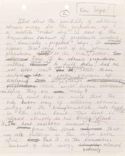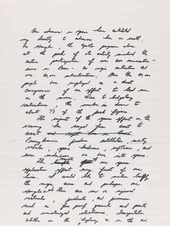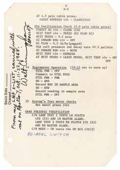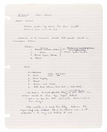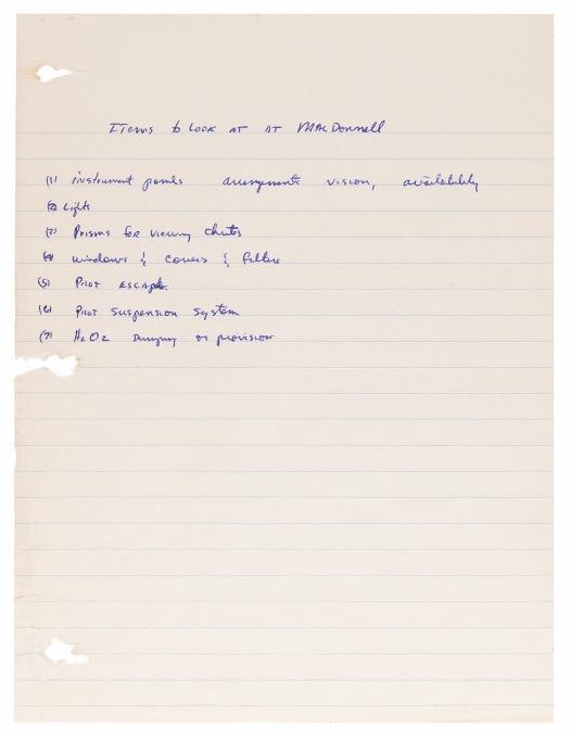 4006. Gordon Cooper Handwritten Meeting Notes with Chris Kraft on Mercury Rocket Abort System. Handwritten notes by Gordon Cooper from a meeting he had with Flight Director Christopher Kraft during his Project Mercury training. The notes, which are penned in black ballpoint on an off-white 8.5 x 11 notebook page, are headed “15 Jun 59, Chris Kraft,” and contain several topics related to the possibility of aborting the Mercury flight. The notes read, in part: “Abort System / Redstone system (By ABMA) has been accepted / Atlas is still up in the air,” “Quantities to be measured in missiles that would indicate a catastrophic failure: Redstone: 1. Attitude 2. Rate 3. Power supply failure (control system failure) 4. Thrust / Atlas 1. Rate 2. Power supply 3. Thrust 4. Press in LOX tank 5. Diff press between fuel tank & LOX tank,” “will have a 30 second after pad delay on engine shut off so that RSO can allow missile to clear Cape before destruct (accel is so low here that abort system should be able to clear easily),” and “There will be a 3 second time delta between RSO engine cut off and destruct. This is the minimum and is not automatic — it may not destruct at all.” In fine condition. Accompanied by a letter of authenticity from Paul Hartunian. Starting Bid $200