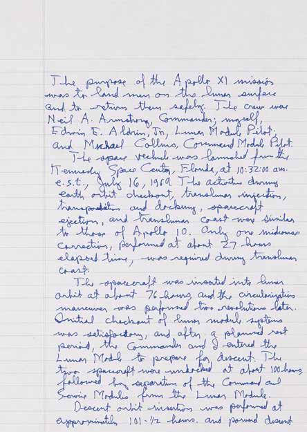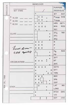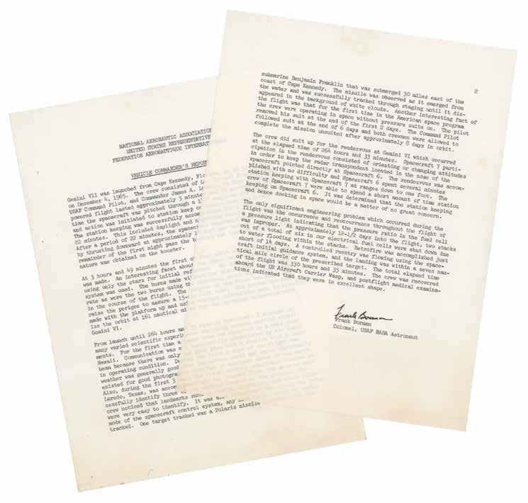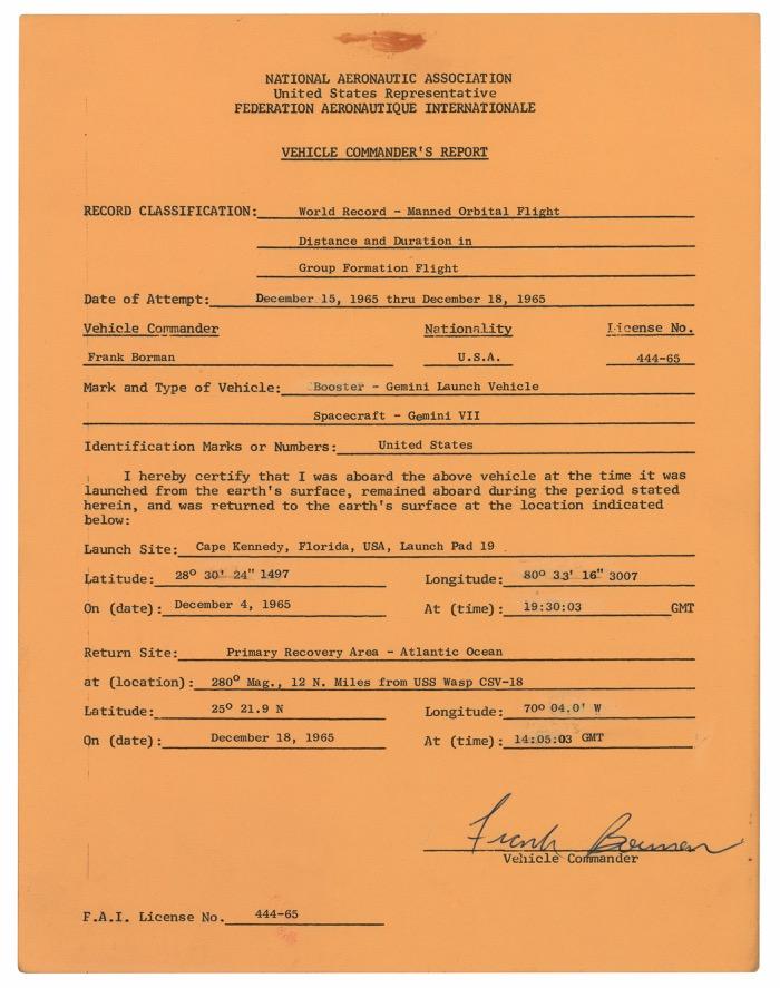 - Issued to the National Aeronautic Association. DS, two pages, 8 x 10.5, no date. A “Vehicle Commander’s Report” issued to the National Aeronautic Association by astronaut Frank Borman for the flight of the Gemini 7 spacecraft. The report, which is signed at the conclusion in black ink by Borman, reads: “Gemini VII was launched from Cape Kennedy, Florida, at 19 30 03 Zulu on December 4, 1965. The crew consisted of Lt. Colonel Frank Borman, USAF Command Pilot, and Commander James A. Lovell, US Navy Pilot. The powered flight lasted approximately 5 minutes and 37 seconds at which time the spacecraft was pitched through a 180° angle on its right side and action was initiated to station keep or remain with the booster. The station keeping was successfully accomplished for a period of 22 minutes. This included daylight and nighttime station keeping. After a period of 22 minutes, the spacecraft separated from the booster by thrusting downward at approximately 10 feet per second. For the remainder of the first night pass the booster was tracked and a IR signature was obtained on the booster.