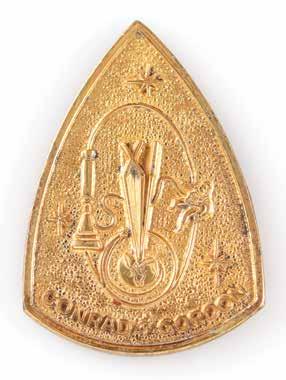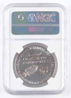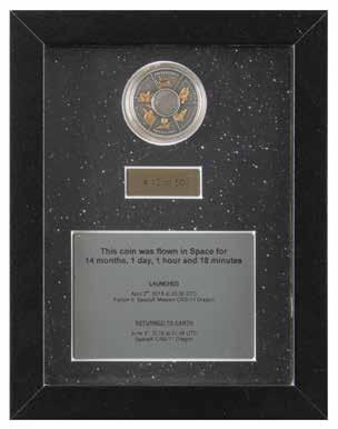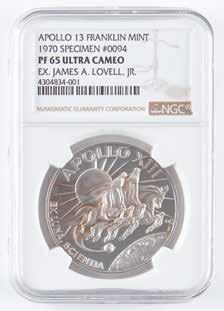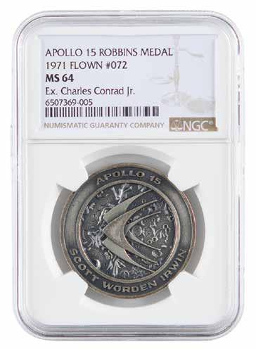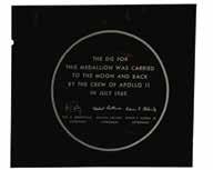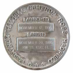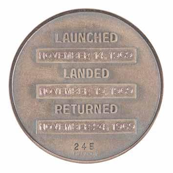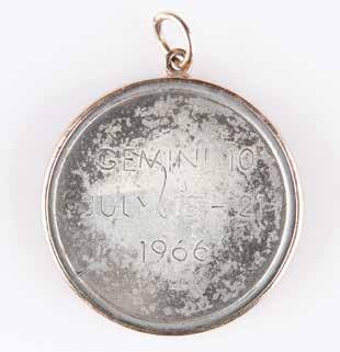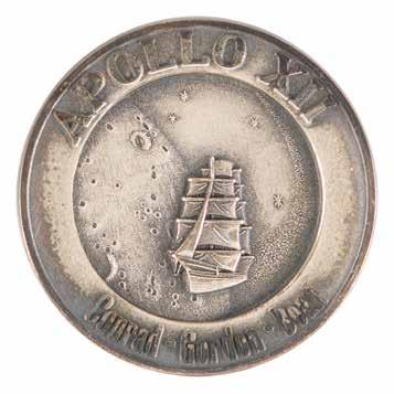 - a flown sterling silver Fliteline medallion carried on Gemini 3, approximately 1˝ in diameter, featuring an image of the GT-3 ‘Molly Brown’ spacecraft on the front, along with the names of astronauts Virgil I. Grissom and John W. Young, and the
