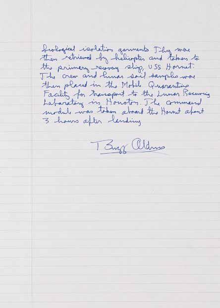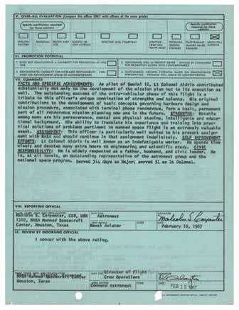 A “Field Grade Officer Effectiveness Report” for Lt. Colonel Edwin E. ‘Buzz’ Aldrin, Jr., and his recent performance as pilot of the Gemini 12 mission. Aldrin earned high praise, attaining a uniformly maximum rating in every ‘checkbox’ category, with the comments section reading, in part: “FACTS AND SPECIFIC ACHIEVEMENTS: As pilot of Gemini 12, Lt Colonel Aldrin contributed substantially not only to the development of the mission plan but to its execution as well. The outstanding success of the extra-vehicular phase of this flight is a tribute to this officer’s unique combination of strengths and talents. His original contributions to the development of basic concepts governing hardware design and mission procedure, associated with terminal phase rendezvous, form a basic, permanent