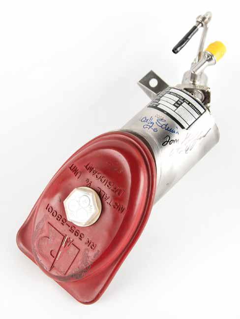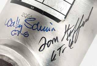 4024. Gemini 6 Crew-Signed Rocketdyne SE-6 Rocket Engine. Rocketdyne SE-6 thruster designed for the Gemini Reentry Control System (RCS), measuring approximately 10? x 4? x 3?, signed on the body in blue and black felt tip by the crew of Gemini 6A, “Wally Schirra, GT-6” and “Tom Stafford, GT-6. “ The manufacturer’s label affixed above: “Part Name: Thrust Cha[m]ber Assy OF, Mfd. by Rocketdyne for McDonnell, Part No. 208130-71, Mod. No. SE6, Ser. 4060122, McDonnell Part No. SCD52-52700-239.” Complete with its red Rocketdyne protective cover with desiccant packet inside. In fine condition.