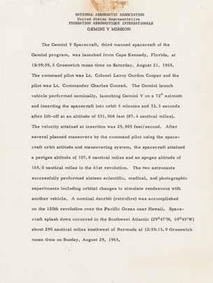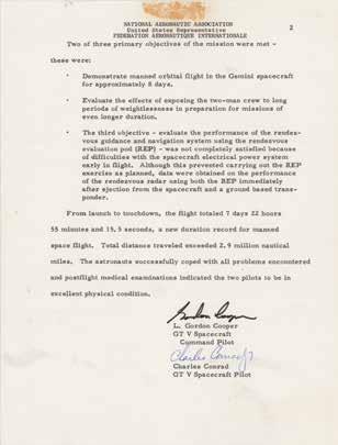 4029. Gemini 5 Signed Mission Report - Issued to the National Aeronautic Association. DS, signed “Charles Conrad, Jr.” and “Gordon Cooper,” two pages, 8 x 10.5, no date. Flight report for the “Gemini V Mission” issued by astronauts Charles Conrad and Gordon Cooper to the National Aeronautic Association, which reads: “The Gemini V Spacecraft, third manned spacecraft of the Gemini program, was launched from Cape Kennedy, Florida, at 13:59:59.5 Greenwich mean time on Saturday, August 21, 1965.